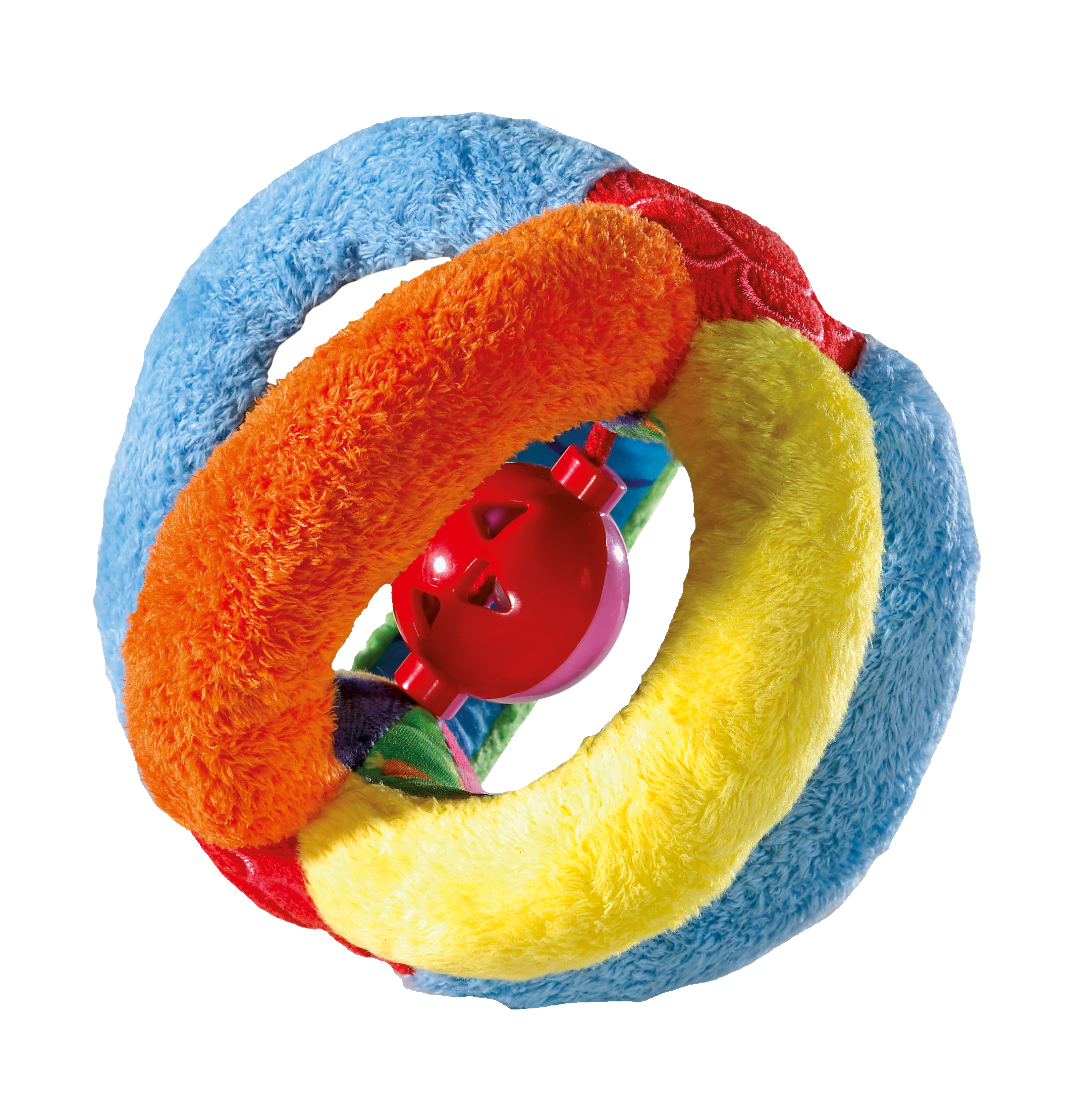 Leicht zu greifender Ball aus flauschigem Plüsch · Mit bunter Drehkugel und sanftem Klingelgeräusch · Durchmesser: ca. 13 cmAn seinen festen, flauschigen Streben können schon die Kleinsten diesen Ball ganz leicht greifen. Im Innern ist eine große bunte Kugel befestigt, die beim Drehen und Schütteln sanft klingelt. Fortgeschrittene können sich schon mit Rollen und Werfen versuchen.