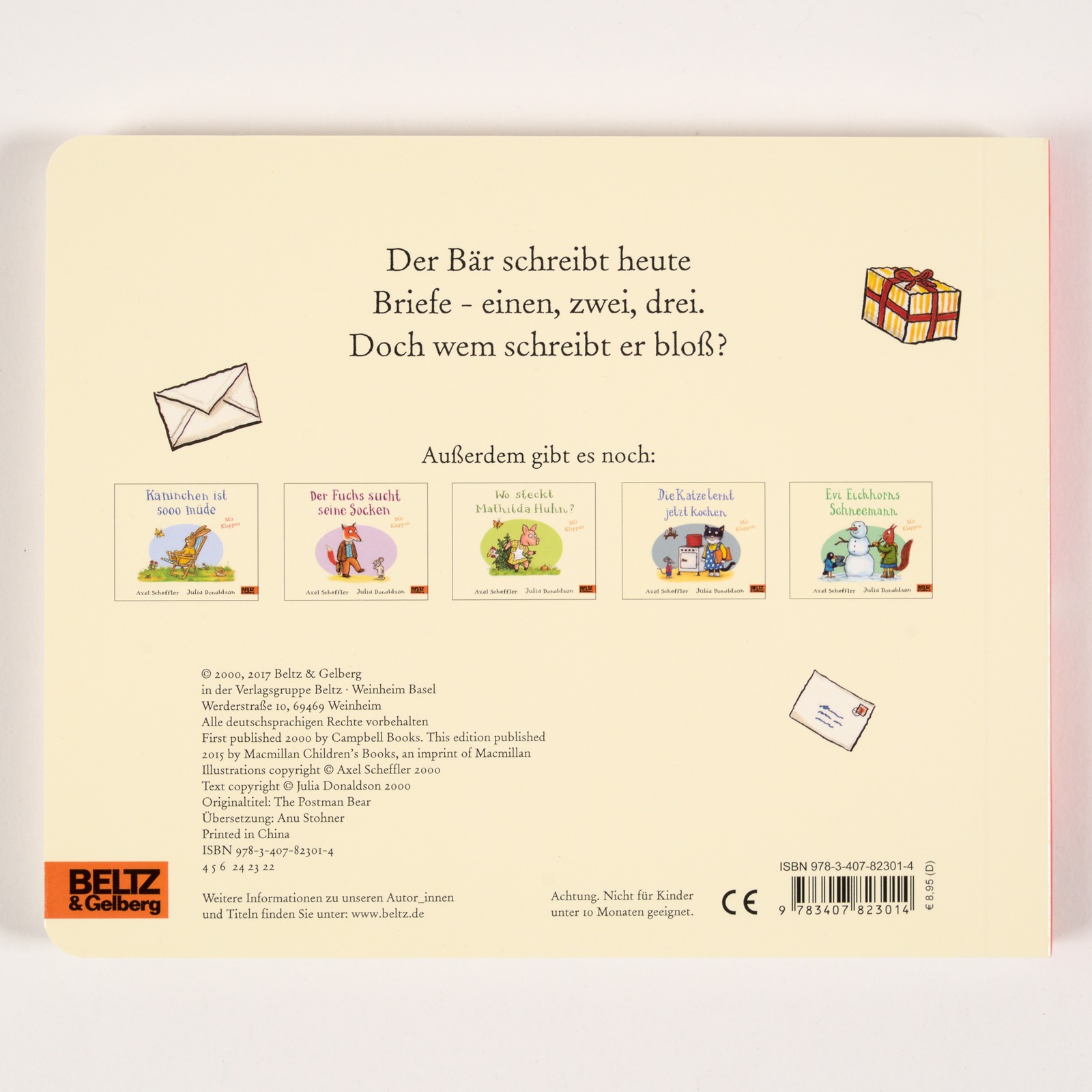 Der Bär schreibt heute Briefe - einen, zwei, drei. Doch wem schreibt er bloß? Ein Pappbilderbuch von den Schöpfern des Grüffelo mit vielen Klappen für neugierige Kinder, die begeistert beim Suchen helfen können.Weitere Geschichten aus dem Eichenwald:- Der Fuchs sucht seine Socken- Wo steckt Mathilda Huhn?- Die Katze lernt jetzt kochen- Kaninchen ist sooo müde- Evi Eichhorns Schneemann- Wo ist die Brille von Max Maulwurf?- Der Dachs spielt super Kontrabass