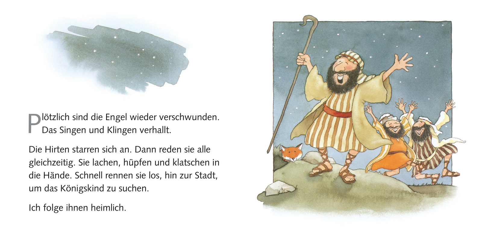 Eigentlich ist der Fuchs bloß auf der Suche nach etwas zu fressen, als plötzlich seltsame Dinge geschehen. Mitten in der Nacht erstrahlt ein helles Licht und der Fuchs hört Engel singen. Neugierig macht er sich auf den Weg und wird dabei Zeuge eines ganz besonderen Ereignisses.
