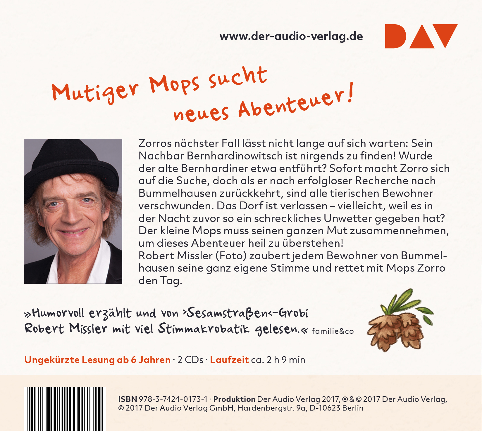 Zorro wartet ungeduldige auf ein neues Abenteuer. Als eines Morgens Bernhardinowitsch plötzlich verschwunden ist, ist Zorro sofort hellwach! Wurde der alte Bernhardiner vielleicht entführt? Sofort macht er sich auf die Suche, doch als er nach erfolgloser Recherche nach Bummelhausen zurückkehrt, ist das Dorf verlassen. Alle Tiere sind verschwunden - vielleicht, weil es in der Nacht zuvor so heftig geregnet hat? Ist vielleicht ein Unglück geschehen? Der kleine Mops muss seinen ganzen Mut zusammennehmen um dieses Abenteuer heil zu überstehen!Ungekürzte Lesung mit Robert Missler2 CDs | ca. 2 h 9 min