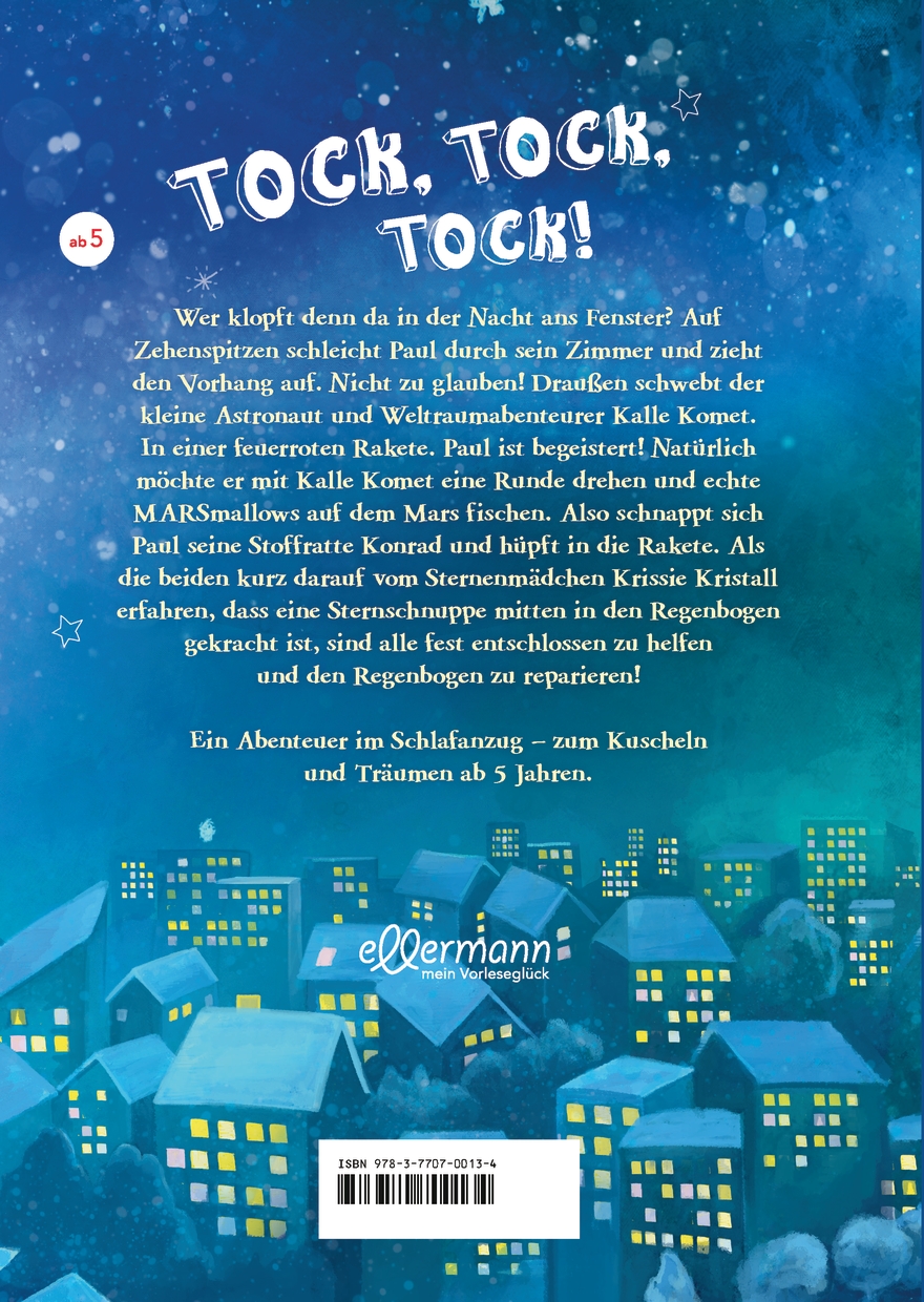"Tock, tock, tock!" Wer klopft denn da in der Nacht ans Fenster? Auf Zehenspitzen schleicht Paul durch sein Zimmer und zieht den Vorhang auf. Nicht zu glauben! Draußen schwebt der kleine Astronaut und Weltraumabenteurer Kalle Komet. In einer feuerroten Rakete. Paul ist begeistert! Natürlich möchte er mit Kalle Komet eine Runde drehen und echte MARSmallows auf dem Mars fischen. Also schnappt sich Paul seine Stoffratte Konrad und hüpft in die Rakete. Als die beiden kurz darauf vom Sternenmädchen Krissie Kristall erfahren, dass eine Sternschnuppe mitten in den Regenbogen gekracht ist, sind alle wild entschlossen zu helfen und den Regenbogen zu reparieren!