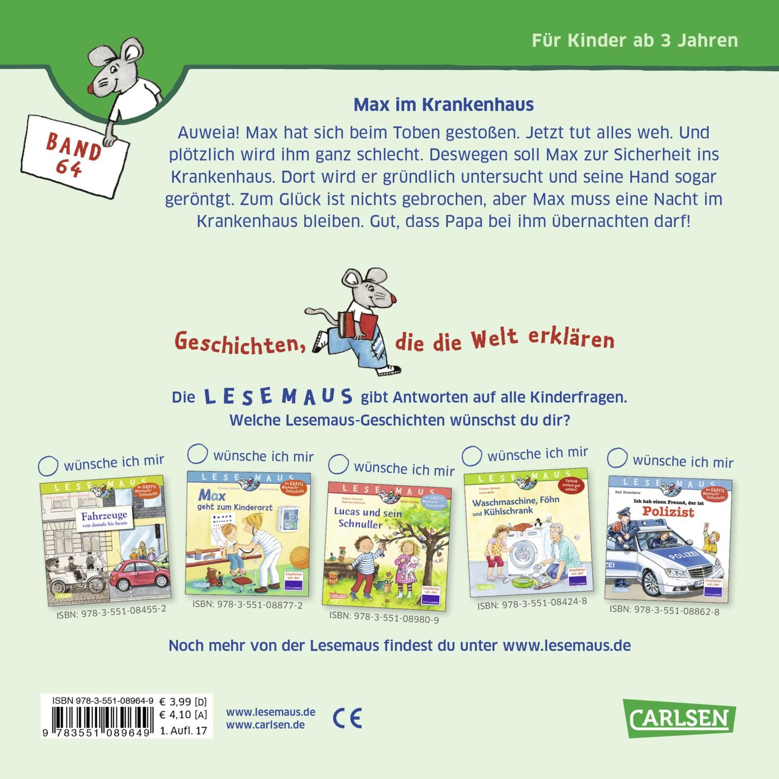 Auweia! Max hat sich beim Toben gestoßen. Jetzt tut alles weh. Und plötzlich wird ihm ganz schlecht. Deswegen soll Max zur Sicherheit ins Krankenhaus. Dort wird er gründlich untersucht und seine Hand sogar geröntgt. Zum Glück ist nichts gebrochen, aber Max muss eine Nacht im Krankenhaus bleiben. Gut, dass Papa bei ihm übernachten darf!