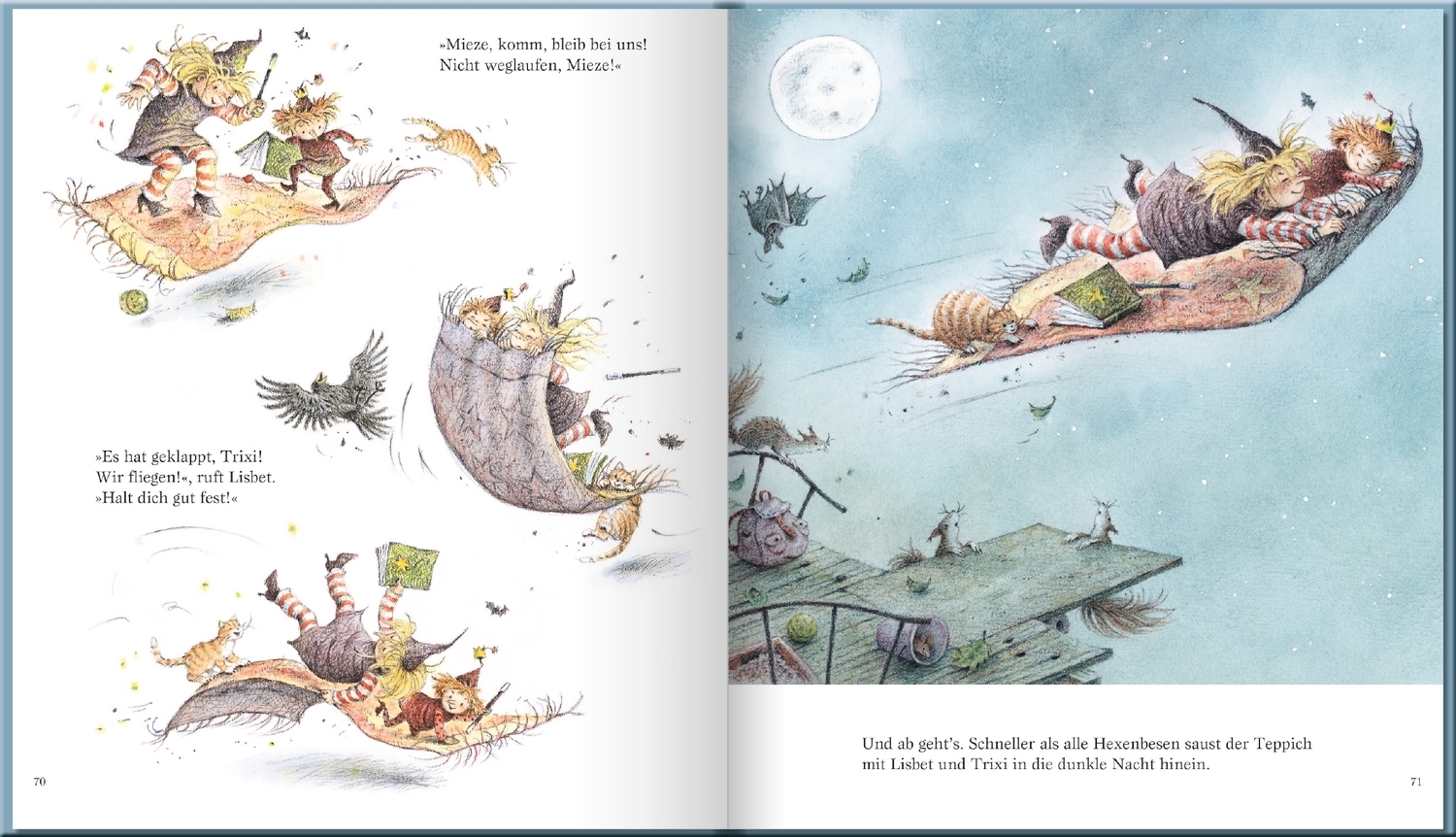 Was entdeckt die kleine Hexe Lisbet in dem geheimnisvollen Haus, in dem spät nachts noch Licht brennt? Was mag in dem seltsamen Koffer sein, der eines Tages vor ihrem Hexenhaus steht? Wie soll Lisbet Geburtstag feiern, wenn ihre Katze verschwunden ist? Welche Abenteuer erwarten sie und das Hexenkind Trixi auf ihrer Reise mit dem fliegenden Teppich? Und wird alles vorbereitet sein, bevor die Weihnachtshexe klopft?