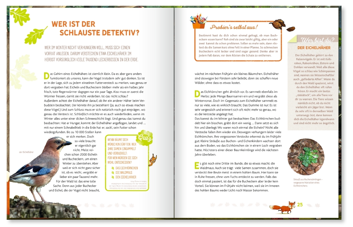 S.6 Vorwort S.8 Wie ein Baum funktioniert S.10 Wie atmen Bäume? S.12 Kann ein Baum dünner werden? S.14 Bekommen auch Bäume Pickel? S.16 Wie hält sich ein Baum fest? S.18 Familienleben im Wald S.20 Wie machen Bäume Babys? S.22 Gibt es Opas und Omas auch bei Bäumen? S.24 Was lernen Baumkinder in der Schule? S.26 Haben alle Tiere Familien? S.28 Im Wald wird viel erzählt S.30 Können Bäume sprechen? S.32 Gibt es im Wald ein Internet? S.34 Was erzählen die Vögel S.36 Wie unterhalten sich Wildkatzen und Hirsche? S.38 Jeder Baum ist anders S.40 Wovor haben Bäume Angst? S.42 Sind manche Bäume lieber allein? S.44 Gibt es mutige Bäume? S.46 Welche Bäume brechen Rekorde? S.48 Jeder Baum ist anders S.50 Wie trinken Bäume? S.52 Können Wälder Regen machen? S.54 Wie reinigt der Wald das Wasser? S.56 Warum brennt der Wald? S.58 Bäume und ihre Nachbarn S.60 Warum sind Sträucher so klein? S.62 Wer klettert hoch hinauf? S.64 Wie viele Rehe leben im Wald? S.66 Warum wachsen im Wald nur wenige Blumen? S.68 Wie Tiere im Wald leben S.70 Wer wohnt ganz oben? S.72 Wer passt in ein Blatt? S.74 Wer wohnt im Dunkeln? S.76 Wie leben Rehe und Wildschweine? S.78 Was Tiere können S.80 Gehen auch Tiere zur Schule? S.82 Wie schlau sind Insekten? S.84 Wer ist der beste Detektiv? S.86 Welche Tiere haben Haustiere? S.88 Auch im Wald sind nicht alle gesund S.90 Warum wachsen an Bäumen Pilze? S.92 Was macht Bäume krank? S.94 Woran erkennst du kranke Tiere? S.96 Worauf solltest du im Wald achten? S.98 Das Jahr im Wald S.100 Wie merken Bäume, dass der Frühling kommt? S.102 Schwitzen Bäume im Sommer? S.104 Warum werfen Bäume im Herbst ihre Blätter ab? S.106 Wovon leben Bäume und Tiere im Winter? S.108 Der Wald und wir S.110 Wofür brauchen wir Holz? S.112 Warum haben viele Tiere Angst vor uns? S.114 Sind Wölfe gefährlich? S.116 Wem gehört der Wald? S.118 Bäume und Tiere in der Stadt S.120 Warum sind Bäume in der Stadt wichtig? S.122 Weshalb mögen Bäume keine Hunde? S.124 Was machen Bäume nachts? S.126 Welche Tiere leben in der Stadt? S.128 Fotonachweis