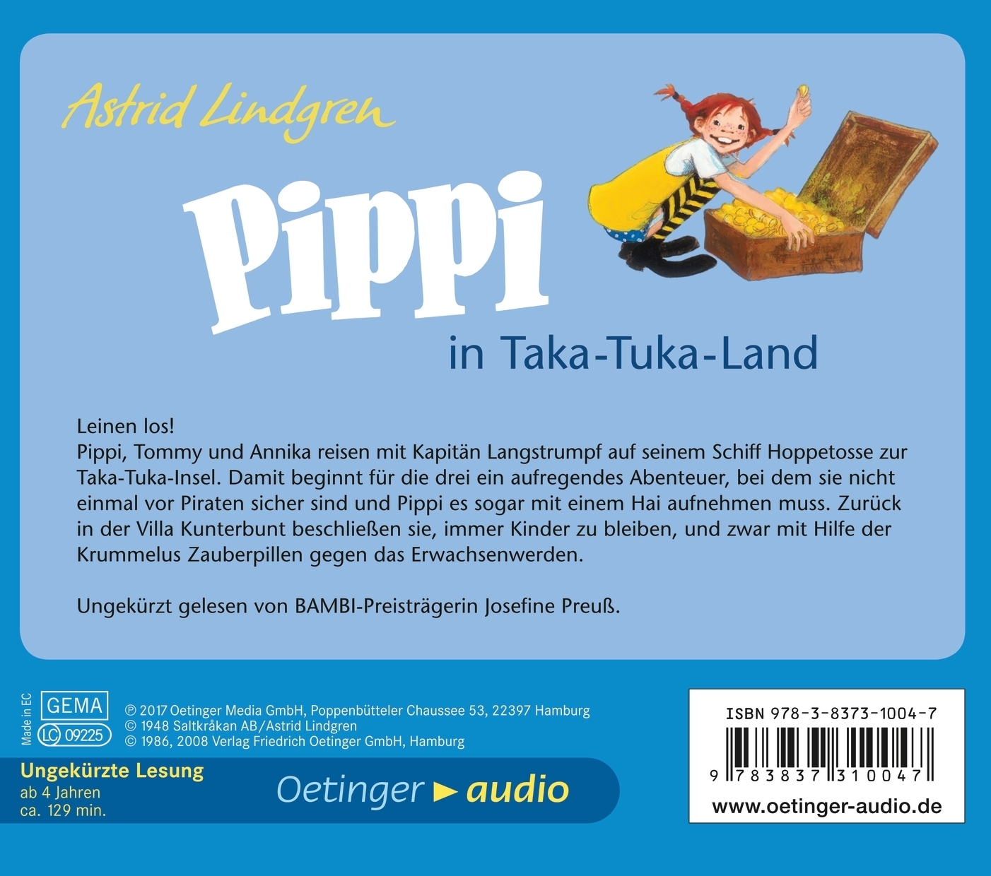 | Schlagworte | Abenteuer • Ferien • Ferien; Kinder-/Jugendliteratur • Frech • Freiheit • Freundschaft • Freundschaft; Kinder-/Jugendliteratur • Herr NiIsson • Hörbuch; Hörspiel für Kinder/Jugendliche • Humor • Kinderbuch ab 4 • Kinder, Jugendliche und Bildung • Klassiker • Kleiner Onkel • Mut • Oetinger Media • Pippi Langstrumpf • PippiLangstrumpf • Piraten • Schiff • Schweden • Seereise • selbstbewusst • Skandinavien • Sommersprossen • starkes Mädchen • Südsee • Tommy und Annika • Unsinn • Villa Kunterbunt |
