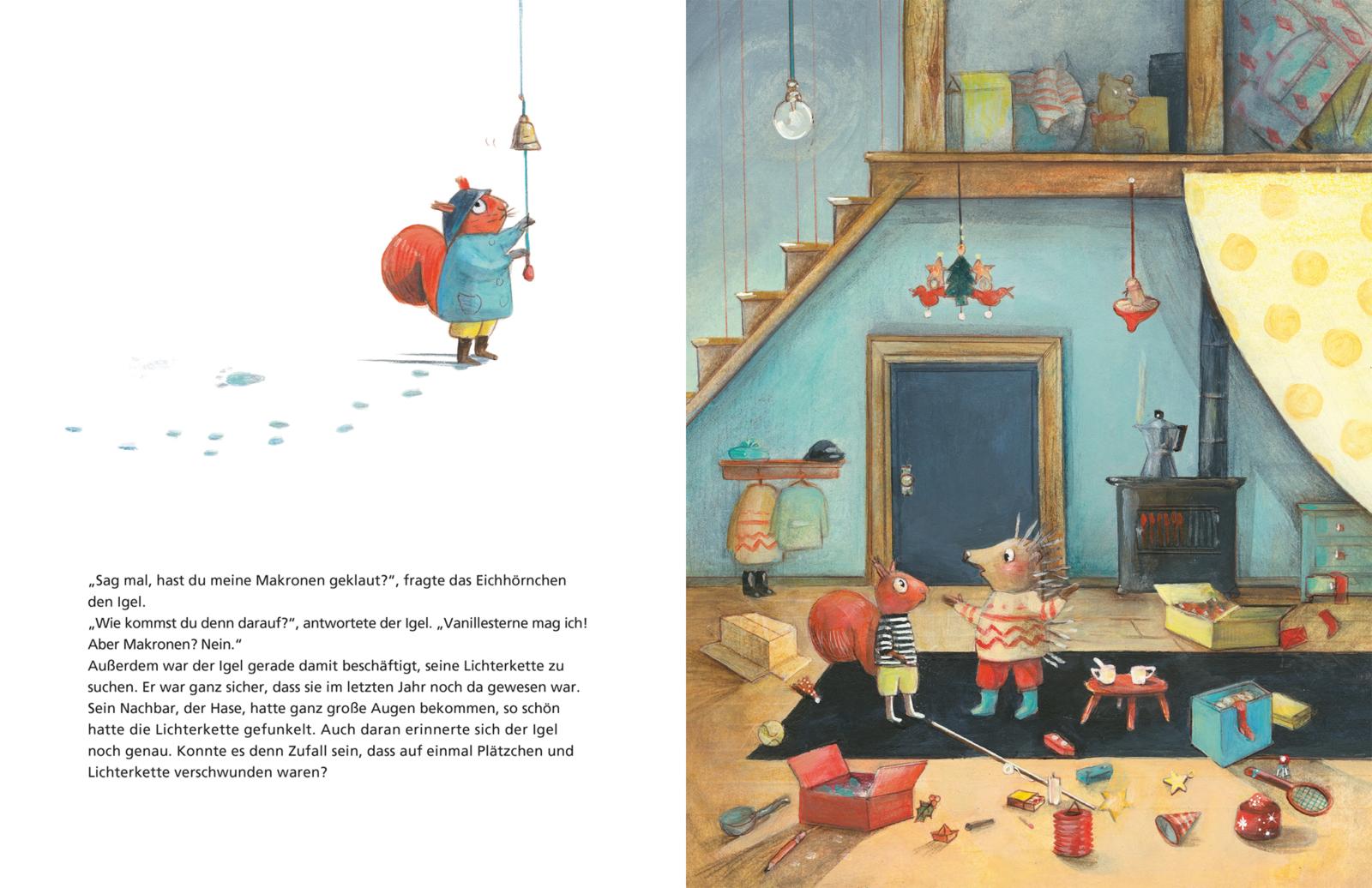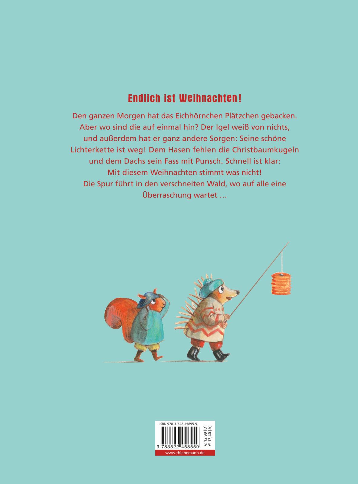 Endlich ist Weihnachten! Den ganzen Morgen hat das Eichhörnchen Plätzchen gebacken. Aber wo sind die denn bloß auf einmal hin? Das Eichhörnchen hat sofort den kleinen dicken Igel von nebenan im Verdacht und stapft zu ihm hinüber. Der Igel weiß von nichts, und außerdem hat er ganz andere Sorgen: Seine Lichterkette ist verschwunden! Dem Hasen fehlen seine schönen Christbaumkugeln und dem Dachs sein Fass mit Punsch.
