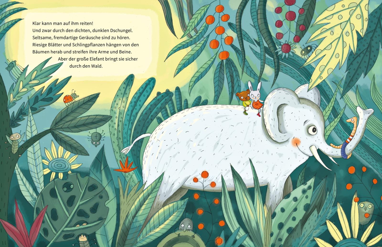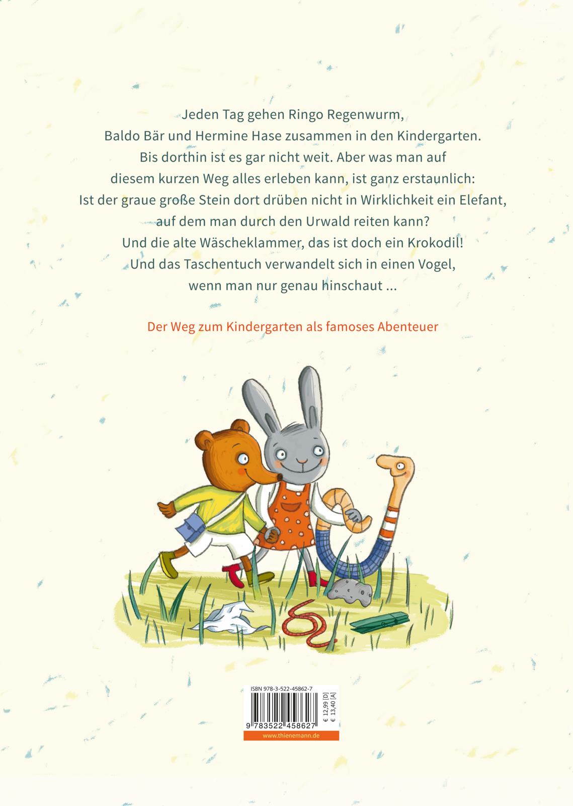 Jeden Tag gehen Ringo Regenwurm, Baldo Bär und Hermine Hase zusammen in den Kindergarten. Bis dorthin ist es gar nicht weit. Aber was man auf diesem kurzen Weg alles erleben kann, ist erstaunlich: Ist der graue große Stein dort drüben nicht in Wirklichkeit ein Elefant, auf dem man durch den Urwald reiten kann? Und die alte Wäscheklammer, das ist doch ein Krokodil! Und ein Taschentuch verwandelt sich in einen Vogel, wenn man nur genau hinschaut...