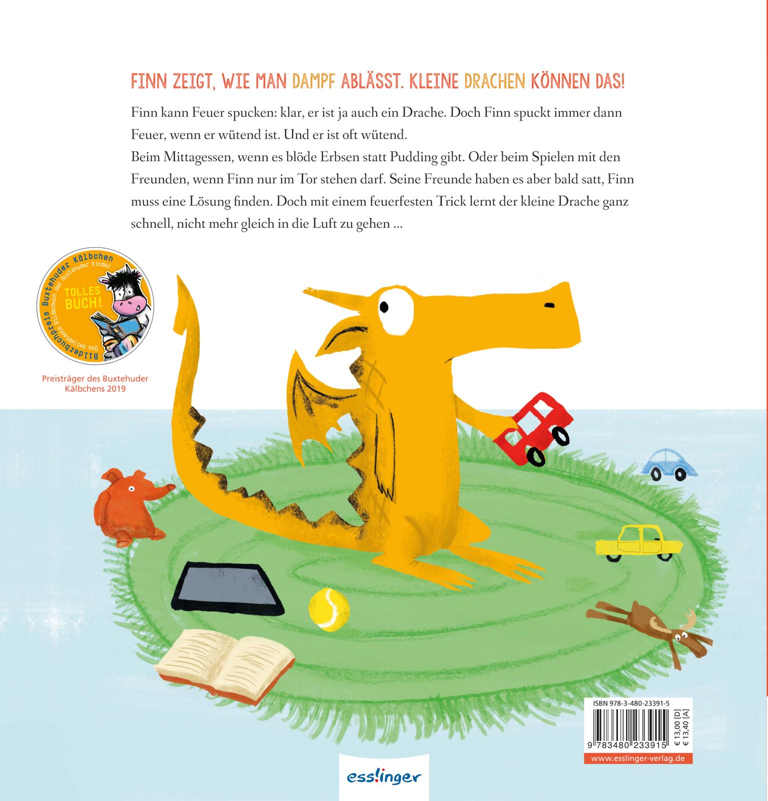 Finn zeigt, wie man am besten mit seiner Wut umgeht Finn kann Feuer spucken: klar, er ist ja auch ein Drache. Doch Finn spuckt immer dann Feuer, wenn er wütend ist. Und er ist oft wütend. Beim Mittagessen, wenn es blöde Erbsen statt Pudding gibt. Oder beim Spielen mit den Freunden, wenn Finn nur im Tor stehen darf. Seine Freunde haben es aber bald satt, Finn muss eine Lösung finden. Doch mit einem feuerfesten Trick lernt der kleine Drache ganz schnell, nicht mehr gleich in die Luft zu gehen ...