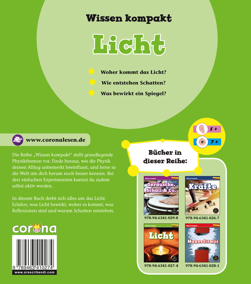 Die Reihe "Wissen kompakt" stellt grundlegende Physikthemen vor. Finde heraus, wie die Physik deinen Alltag unbemerkt beeinflusst, und lerne so die Welt um dich herum noch besser kennen. Bei drei einfachen Experimenten kannst du zudem selbst aktiv werden.In diesem Buch dreht sich alles um das Licht. Erfahre, was Licht bewirkt, woher es kommt, was Reflexionen sind und warum Schatten entstehen.