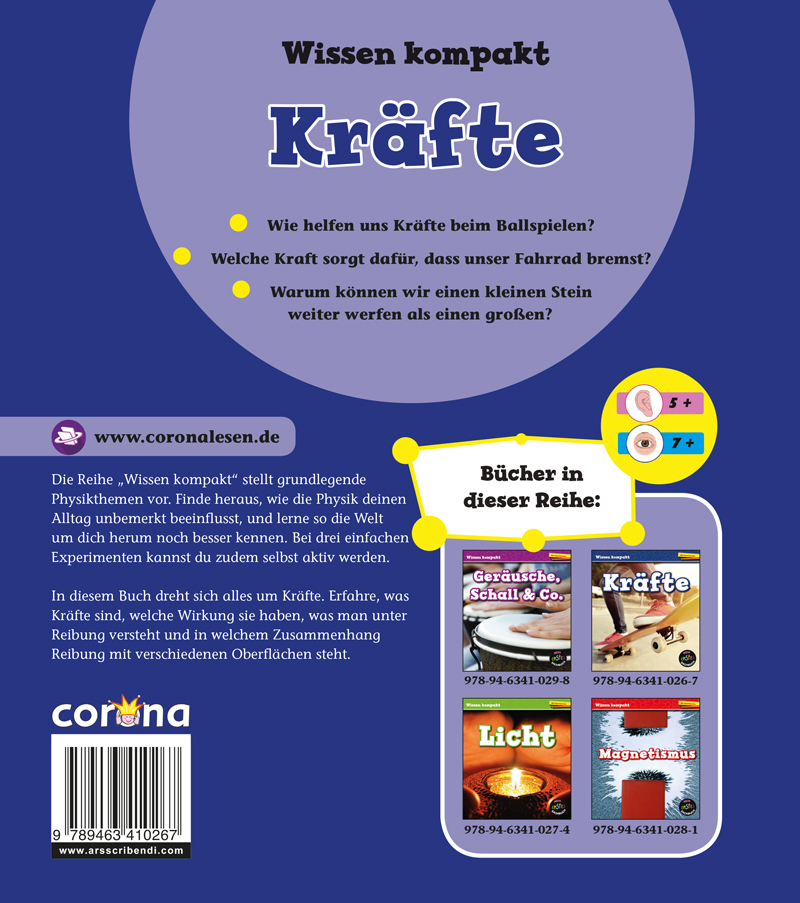 Die Reihe "Wissen kompakt" stellt grundlegende Physikthemen vor. Finde heraus, wie die Physik deinen Alltag unbemerkt beeinflusst, und lerne so die Welt um dich herum noch besser kennen. Bei drei einfachen Experimenten kannst du zudem selbst aktiv werden.In diesem Buch dreht sich alles um Kräfte. Erfahre, was Kräfte sind, welche Wirkung sie haben, was man unter Reibung versteht und in welchem Zusammenhang Reibung mit verschiedenen Oberflächen steht.