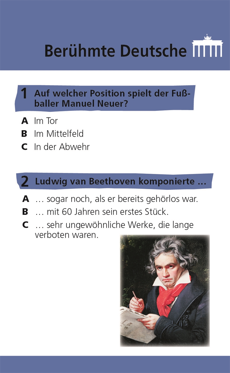 Mit diesem Quiz könnt ihr bei Frage-Antwort-Rätseln euer Wissen rund um das Lieblingsthema "Deutschland" testen. Auf insgesamt 96 spannende Fragen bekommt ihr im memo Quiz verblüffende Antworten. Zu jeder Frage stehen drei mögliche Antworten zur Auswahl - die richtige Lösung verbirgt sich auf der Rückseite! Darüber hinaus gibt es interessante Zusatzinfos und leicht verständliche Erklärungen.