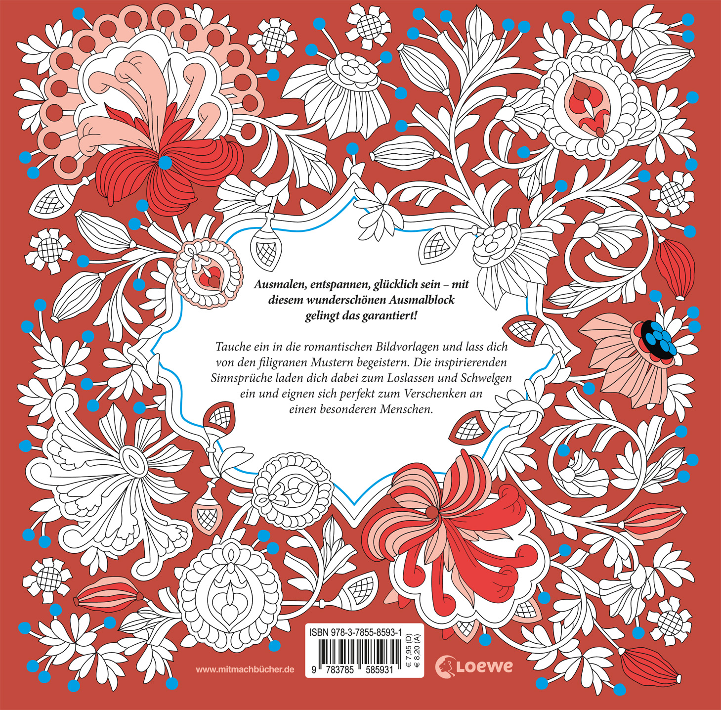 | Schlagworte | Ausmalen • Beschäftigung • entspannen durch malen • entspannen loslassen relaxen • Entspannung; Papeterie • Geschenkbücher • Geschenke für Frauen • Geschenk für Freundin • Kinder zuhause beschäftigen • kreative Auszeit • kreativ geschenk • kreativ malen • Liebe; Papeterie • Malbücher • Malbuch für Erwachsene • Malbuch für Erwachsene (Papeterie) • malen und entspannen • was tun gegen stress |