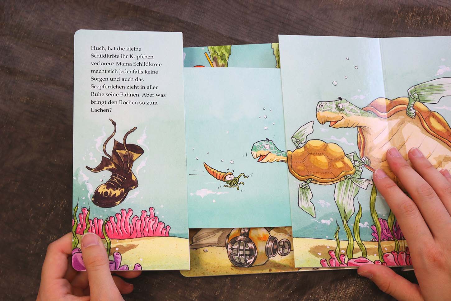 Zieh meine Seiten lang - das sind Pappbilderbücher, deren Seiten sich vollständig ausziehen und dabei Bildelemente verlängern oder neu erscheinen lassen. Animierende Texte bringen so Kindern ab 2 Jahren Unterwasserwelten näher.
