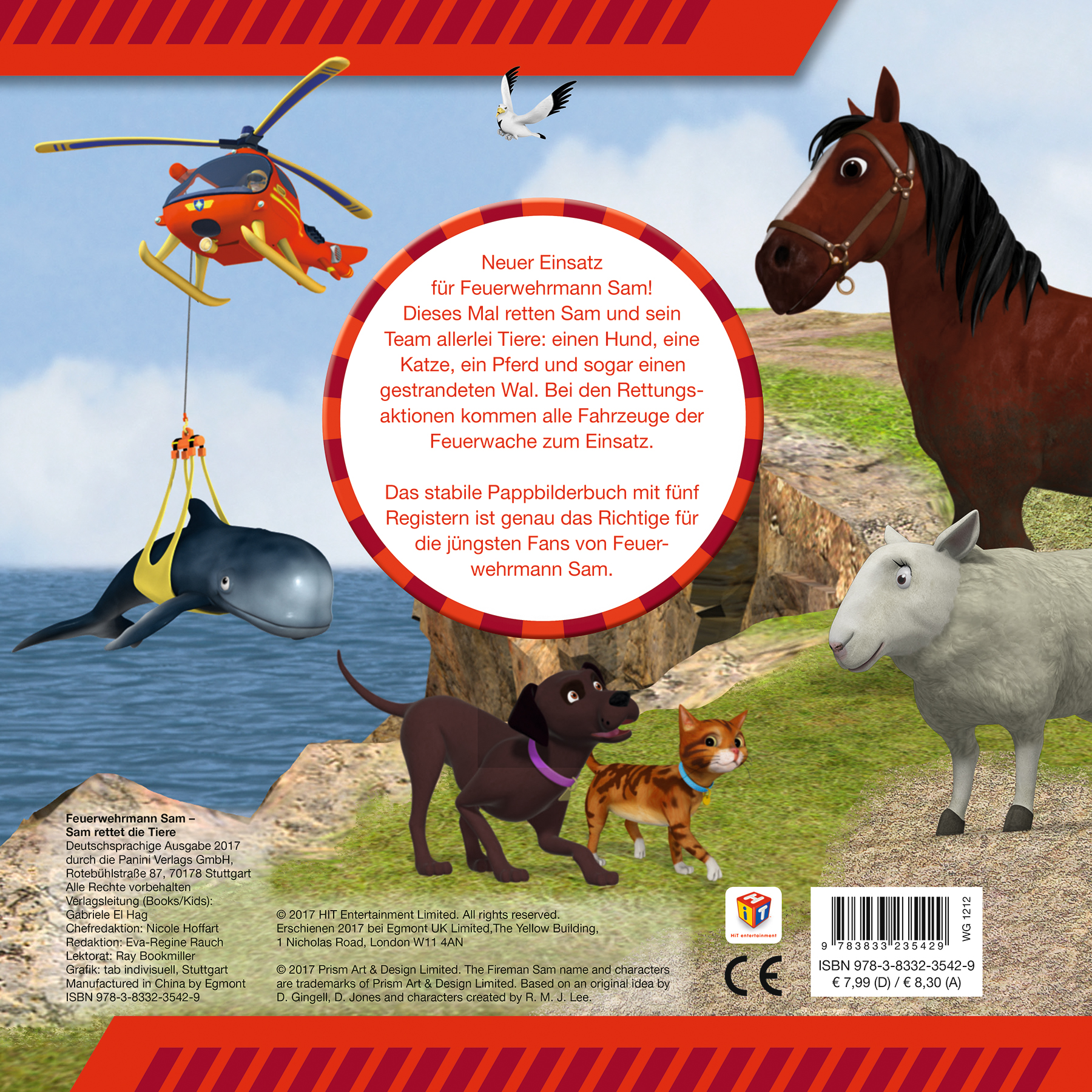 Neuer Einsatz für Feuerwehrmann Sam! Dieses Mal retten Sam und sein Team allerlei Tiere: einen Hund, eine Katze, ein Pferd und sogar einen gestrandeten Wal. Bei den Rettungsaktionen kommen alle Fahrzeuge der Feuerwache zum Einsatz.Das stabile Pappbilderbuch mit fünf Registern ist genau das Richtige für die jüngsten Fans von Feuerwehrmann Sam.