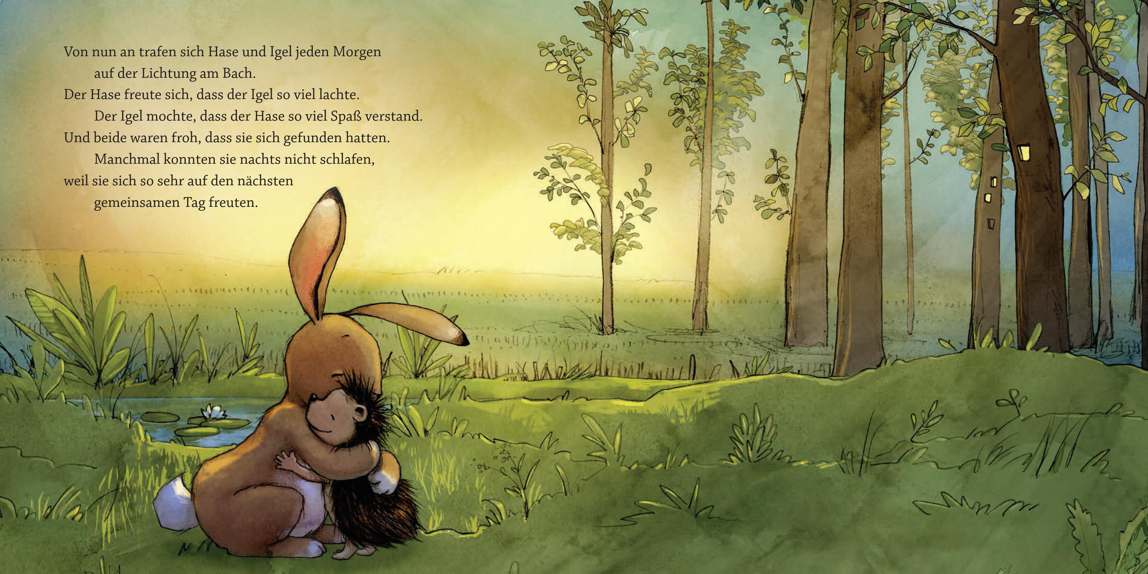 An einem warmen Frühlingsmorgen entdeckt der Hase den Igel. So etwas Stacheliges hat er noch nie gesehen. Ihm gefällt der Igel. Und dem Igel gefällt das weiche Fell des Hasen.Von nun an treffen sich die beiden jeden Morgen auf der Lichtung am Bach, spielen Fangen und Verstecken und beschließen: »Wir wollen Freunde fürs Leben sein!«Doch eines Tages ist der Igel plötzlich verschwunden ...Eine berührende Freundschaftsgeschichte im Wandel der Jahreszeiten für alle Fans von "Weißt du eigentlich, wie lieb ich dich hab?"