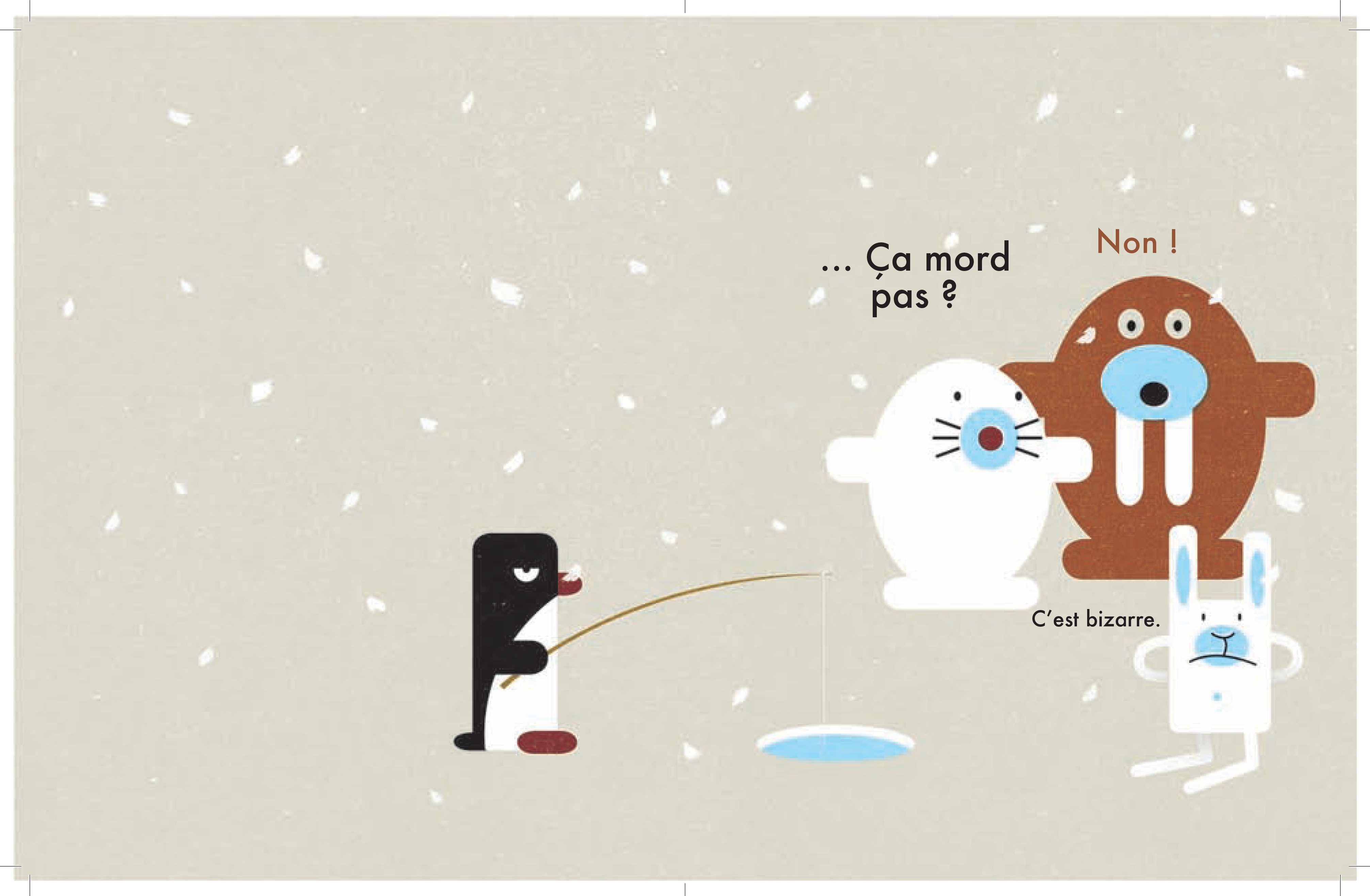 Dieses außergewöhnliche Buch ist eine Übung in Geduld und Vorfreude. Ein etwas genervter Pinguin angelt an einem Eisloch, als sich ein Hase mit einer harmlosen Frage nähert: "Beißen sie?" "Pssst!" schnappt der Pinguin ohne aufzusehen zurück. Dann bemerkt ein Walross die beiden und nähert sich - mit einer ähnlichen Anfrage... Schließlich versammelt sich nach und nach eine ganze Palette lärmender antarktischer Fragesteller: eine Robbe, ein Elch, ein Eisbär und sogar ein Eskimokind!