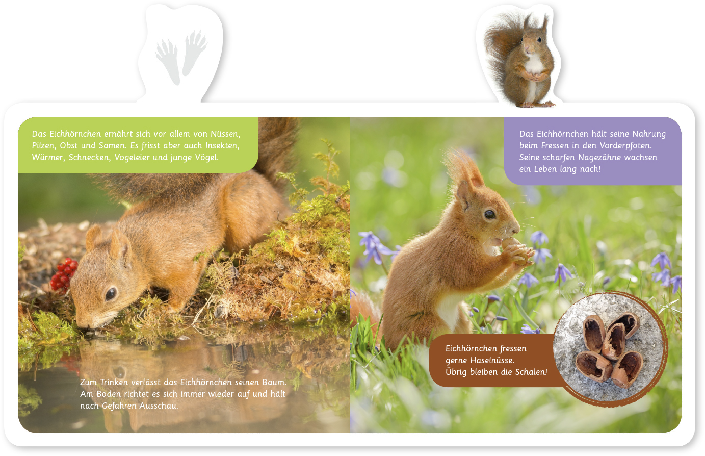 Wie baut das Eichhörnchen sein Nest? Wie zieht es seine Jungen groß? Wie sorgt das Eichhörnchen für den Winter vor? Informative, knappe Texte und detailgenaue Fotos lassen die kleinen (und großen) Leser teilhaben am spannenden Leben des Eichhörnchens. Und selbstverständlich wird auch die Frage beantwortet, warum das Eichhörnchen dafür verantwortlich ist, dass im Frühjahr so viele neue Bäume wachsen ... Mit abgerundeten Ecken und einer reizvollen Tiermotiv-Stanzung.