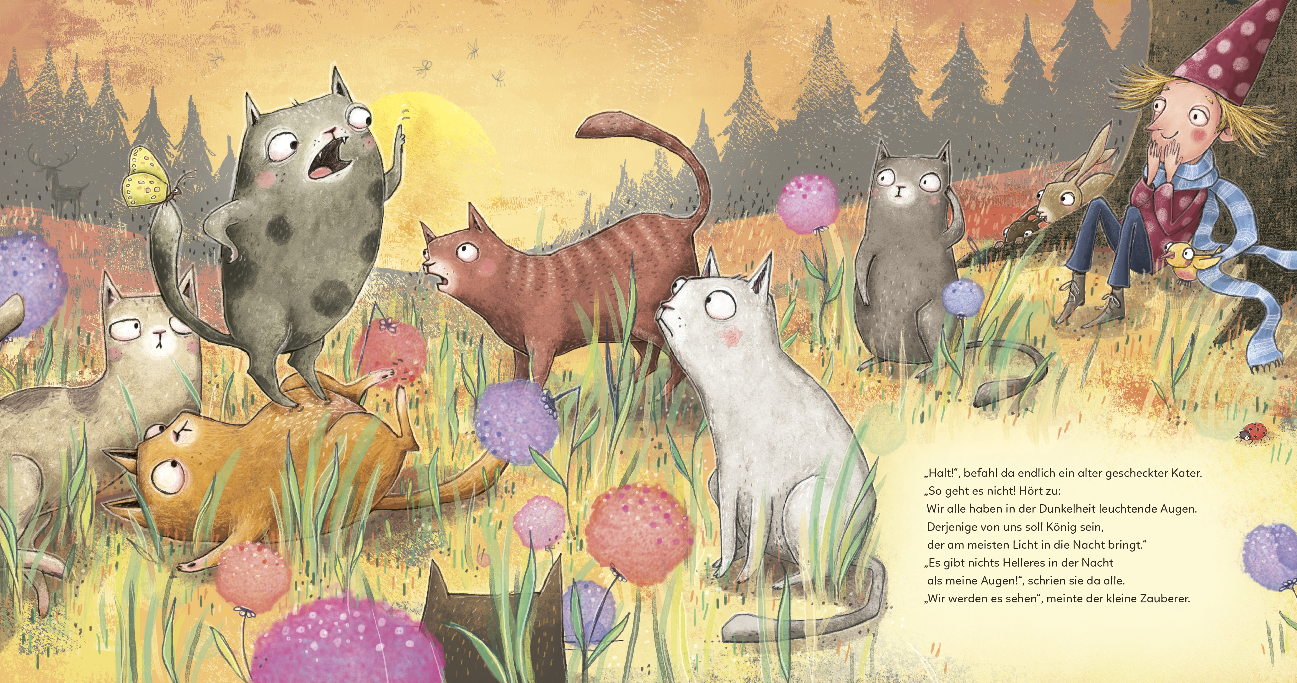 Im Herbst, als die Tage kürzer werden, beschließt der kleine Zauberer, sich ein wenig auszuruhen. Er setzt sich auf den Ast einer Buche, baumelt mit den Beinen und träumt vor sich hin. Doch plötzlich taucht eine Katze auf, eine zweite folgt ihr nach, dann eine dritte. Schließlich ist der kleine Zauberer umgeben von vielen schnurrenden Katzen. Die Katzen bitten den kleinen Zauberer, ihnen eine Königskrone zu zaubern. Weil sie sich aber nicht einigen können, wer die Krone tragen soll, bekommen sie Streit. Ob der kleine Zauberer ihn schlichten kann?