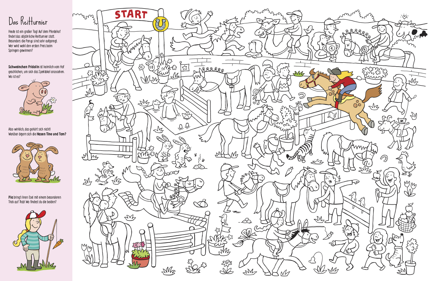 Pony Pauline ist auf dem Pferdehof zu Hause. Natürlich leben da noch jede Menge andere Tiere, und täglich kommen viele Kinder zu Besuch. Sie alle verbringen eine tolle Zeit miteinander und stellen bei einem Ausflug schon mal das ganze Dorf auf den Kopf! So richtig aufregend wird es allerdings, wenn das alljährliche Reitturnier auf dem Hof stattfindet … Auf jeder Seite gibt es witzige Suchaufgaben zu lösen. Und beim Ausmalen finden sich natürlich zahlreiche Überraschungen. Ein großartiger Spaß für alle Pferde-Fans! – Die dicke Pappe ist mit Stiften aller Art bemalbar und liegt beim Malen immer plan auf.