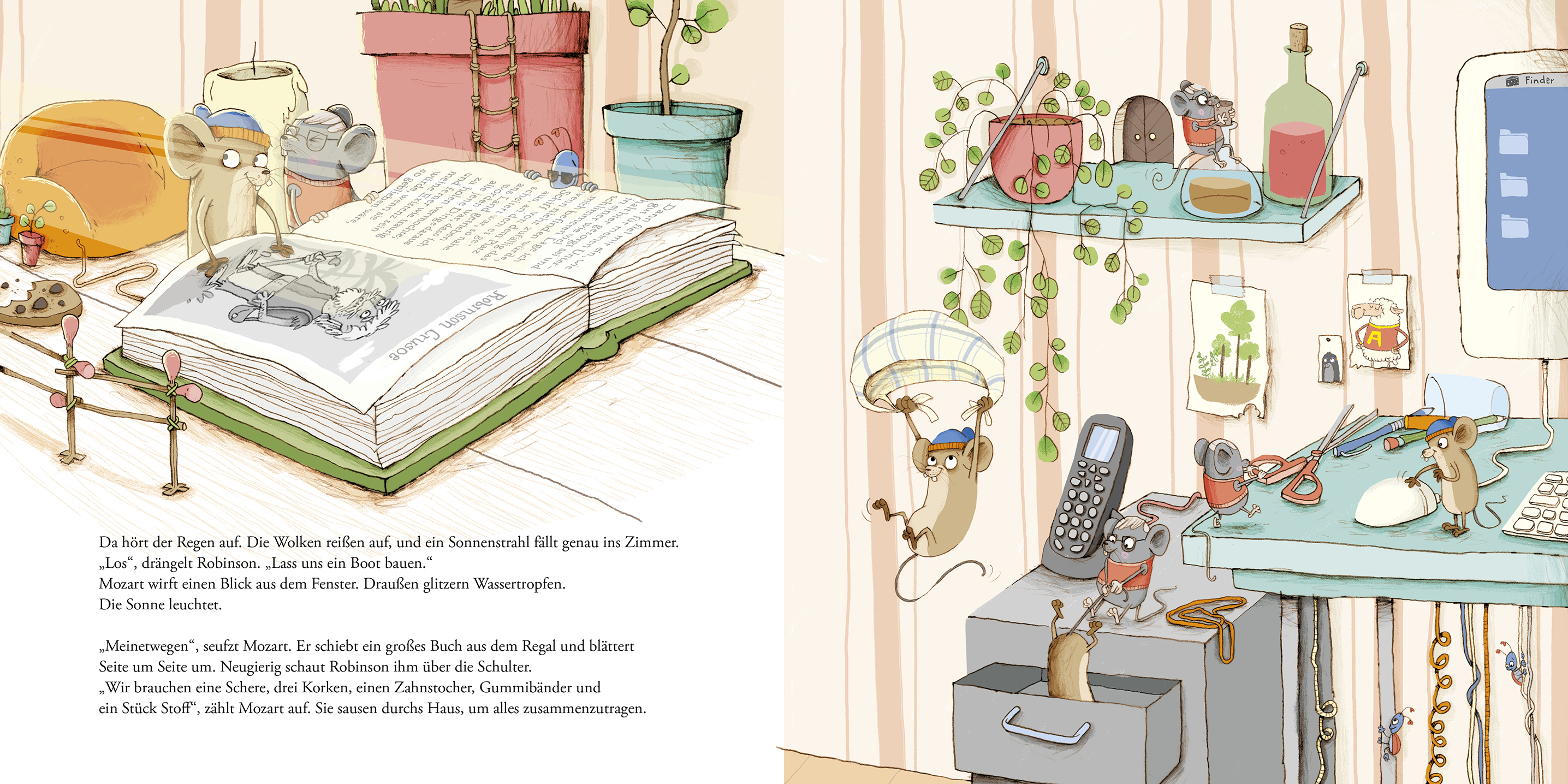 Mozart, die Hausmaus, und Robinson, die Feldmaus, sind trotz aller Unterschiede beste Freunde. Was natürlich noch lange nicht heißt, dass sie immer einer Meinung sind. Der Regen prasselt aufs Dach und Mozart möchte einfach nur in Ruhe in seinem Buch lesen - aber da hat er die Rechnung ohne Robinson gemacht! Der möchte nämlich bitte schön ein Abenteuer erleben und Mozarts Buch bringt ihn die Idee, ein richtiges Robinson-Floß zu bauen ...