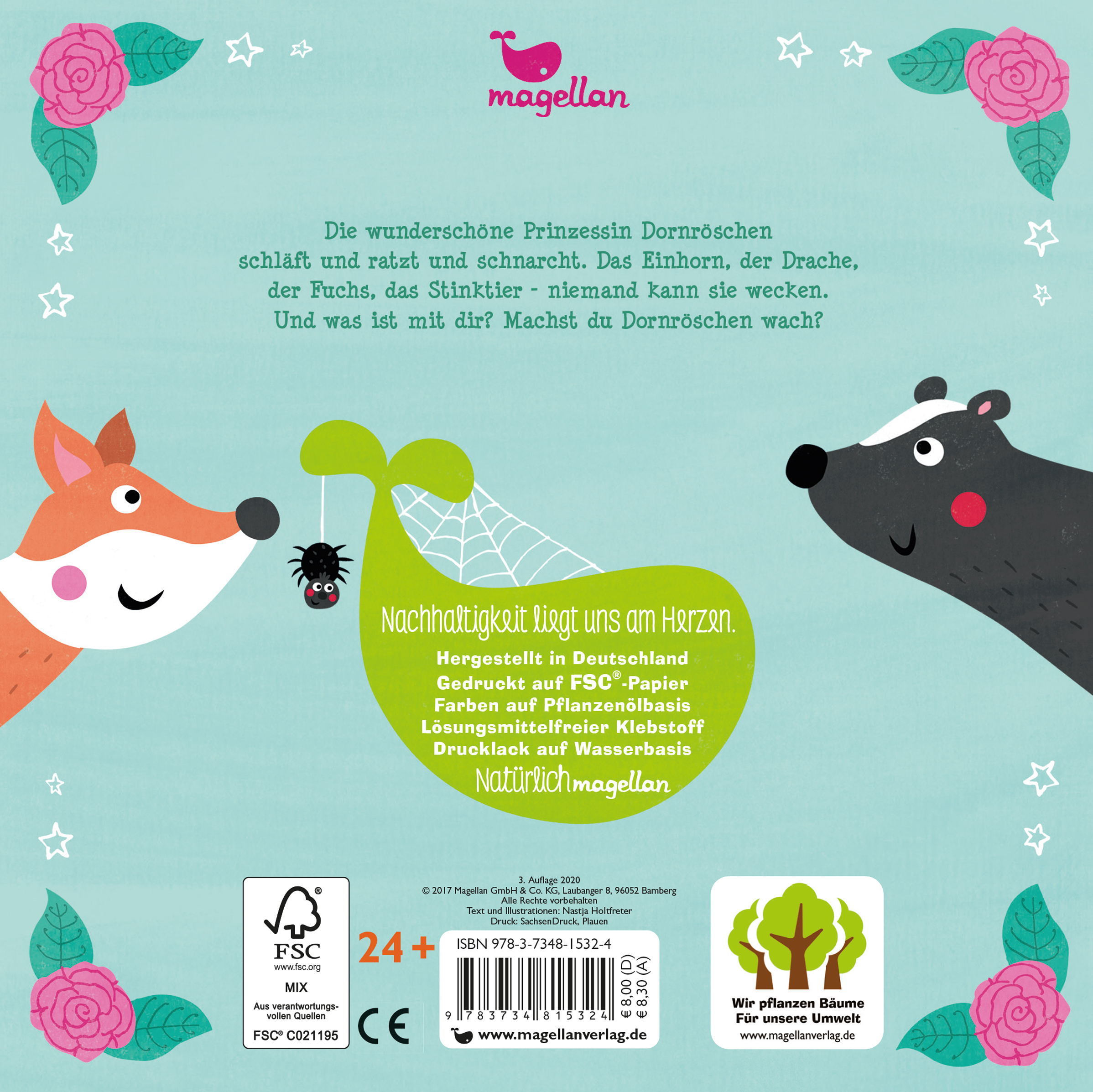 Dornröschen schläft und ratzt und schnarcht seit hundert Jahren. Zeit, es endlich aufzuwecken! Aber das Einhorn kann die Prinzessin nicht wachpusten, ein lauter Drachenschrei hilft ebenso wenig wie kräftiges Wachrütteln und selbst die Duftattacke des Stinktiers bleibt erfolglos. Da kann nur noch der kleine Betrachter helfen! Wie wäre es mit einem echten Aufweck-Kuss für die Prinzessin?