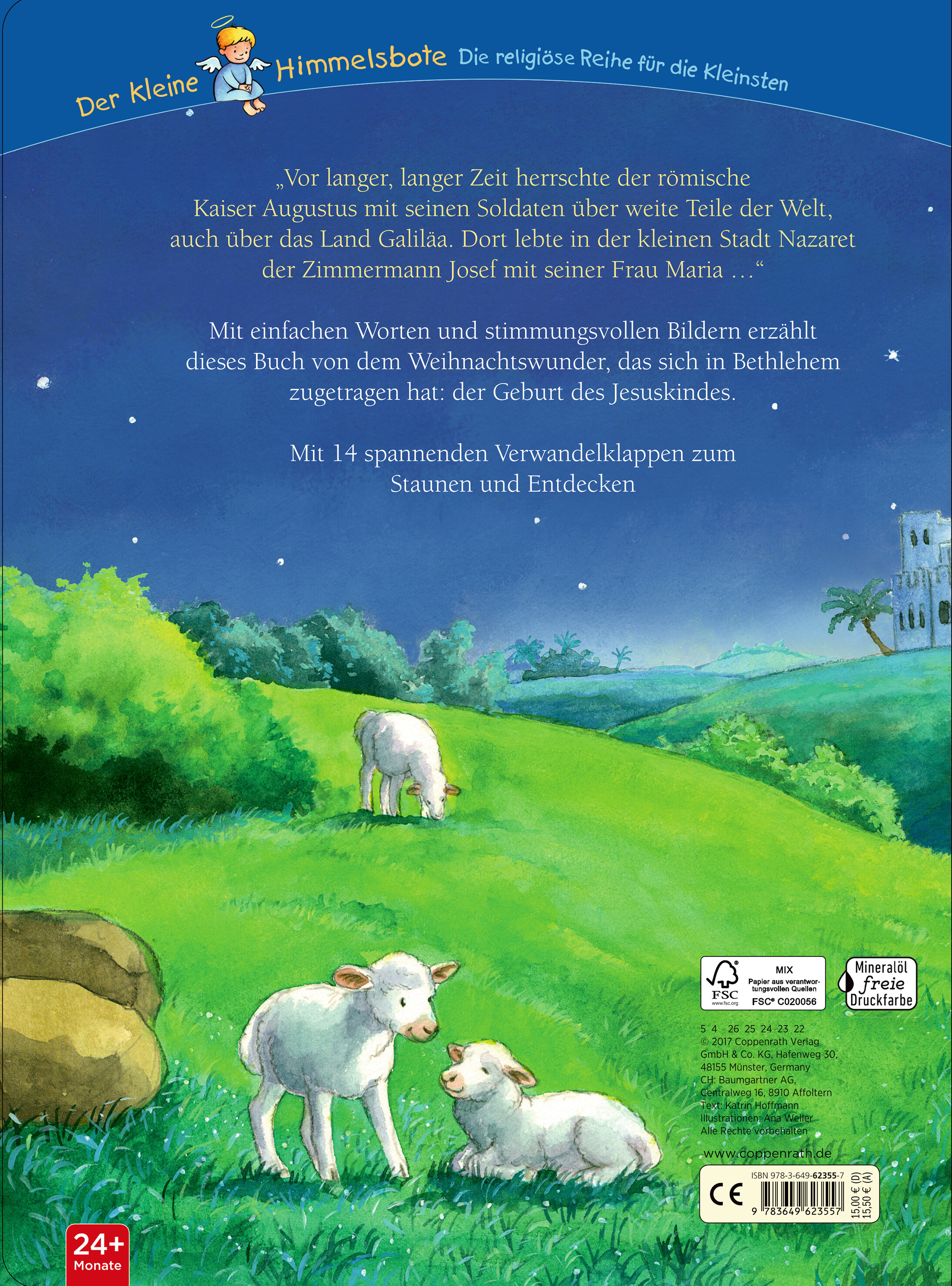 | Schlagworte | Ausklapp-Bilderbuch/Bewegungsbilderbuch • Bethlehem • Biblische Weihnachtsgeschichte • Coppenrath Hölker Bohem • Der kleine Himmelsbote • Geburt • Jesus • Jesuskind • Maria und Josef • Religion • Religiöses Bilderbuch • Weihnachtsgeschichte; Sachbilderbuch |