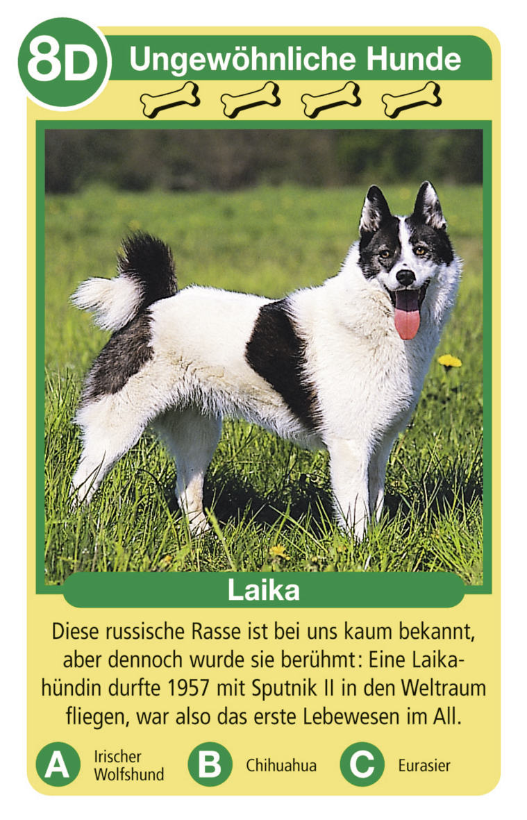 Ein klassisches Quartettspiel rund um die süßen Hunde: Zu den einzelnen auf den Karten abgebildeten Tieren ist jeweils eine Wissensfrage mit 3 Antwortmöglichkeiten aufgedruckt.