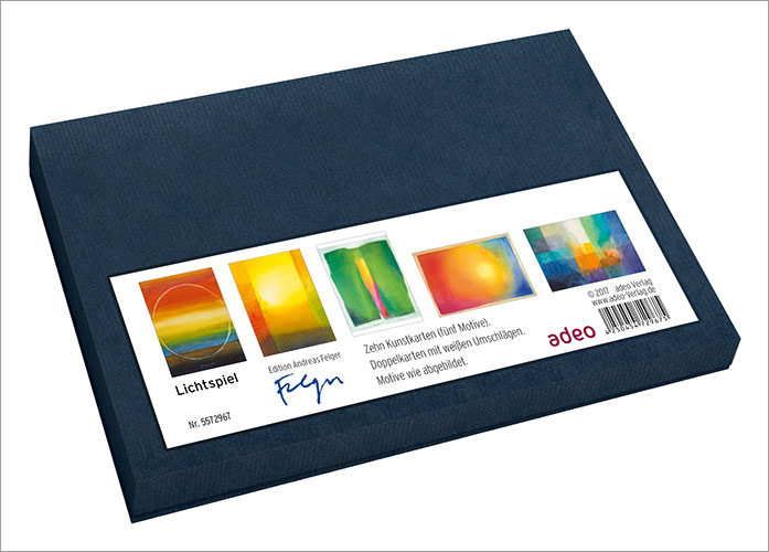 Zehn hochwertige Kunst-Faltkarten mit fünf verschiedenen Motiven des Künstlers Andreas Felger, ohne Text. Format B6 (12 x 17 cm) mit weißen Umschlägen, verpackt in einem hochwertigen Schmuckkarton.