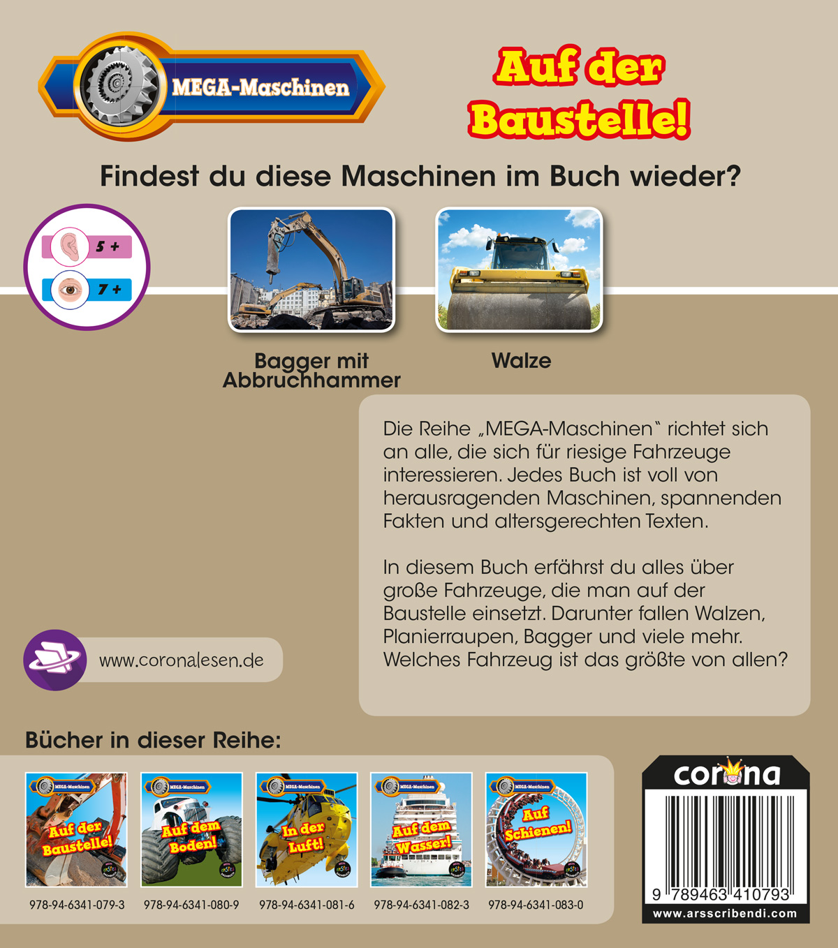 Die Reihe "MEGA-Maschinen" richtet sich an alle, die sich für riesige Fahrzeugeinteressieren. Jedes Buch ist voll von herausragenden Maschinen, spannenden Fakten undaltersgerechten Texten.In diesem Buch erfährst du alles über große Fahrzeuge, die man auf der Baustelle einsetzt.Darunter fallen Walzen, Planierraupen, Bagger und viele mehr. Welches Fahrzeug ist dasgrößte von allen?