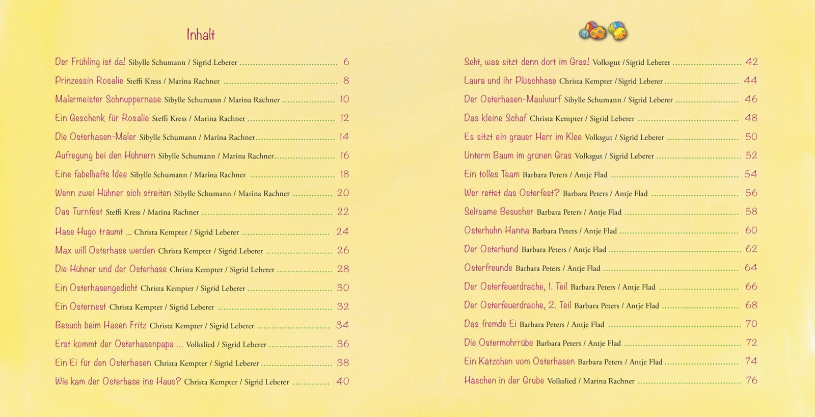 35 kurze, eingängige Geschichten erzählen vom kleinen Hasen Schnuppernase, der beim Eier-Bemalen trödelt, von eingebildeten Hühnern und vom größten Ei, das die Hasenwelt je gesehen hat ... Ein erstes Vorlesebuch mit vielen farbenfrohen Bildern, das garantiert jede Menge Spaß bereitet, bis der Osterhase alle Eier versteckt hat.