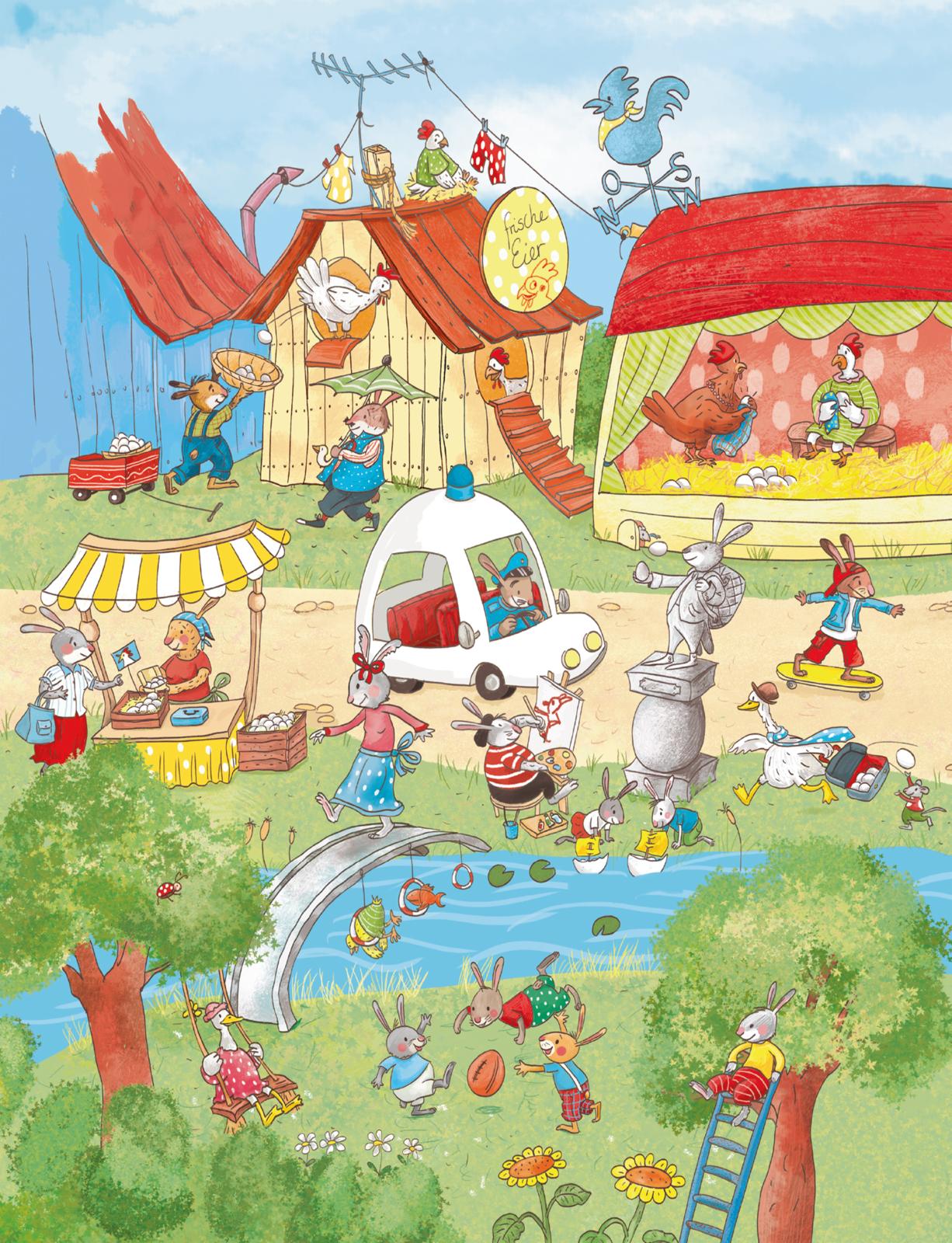 Kurz vor Ostern geht es bei den Hasen rund: Eier werden bemalt, Schokohasen gebaut und der Transport in die ganze Welt vorbereitet. Aber was stellen die Hasen-Zwillinge dabei an, wo steckt der Faulenzer Otto und wer findet das schönste Ei in dieser ganzen Wimmelei? Viel Spaß beim Suchen und Entdecken!