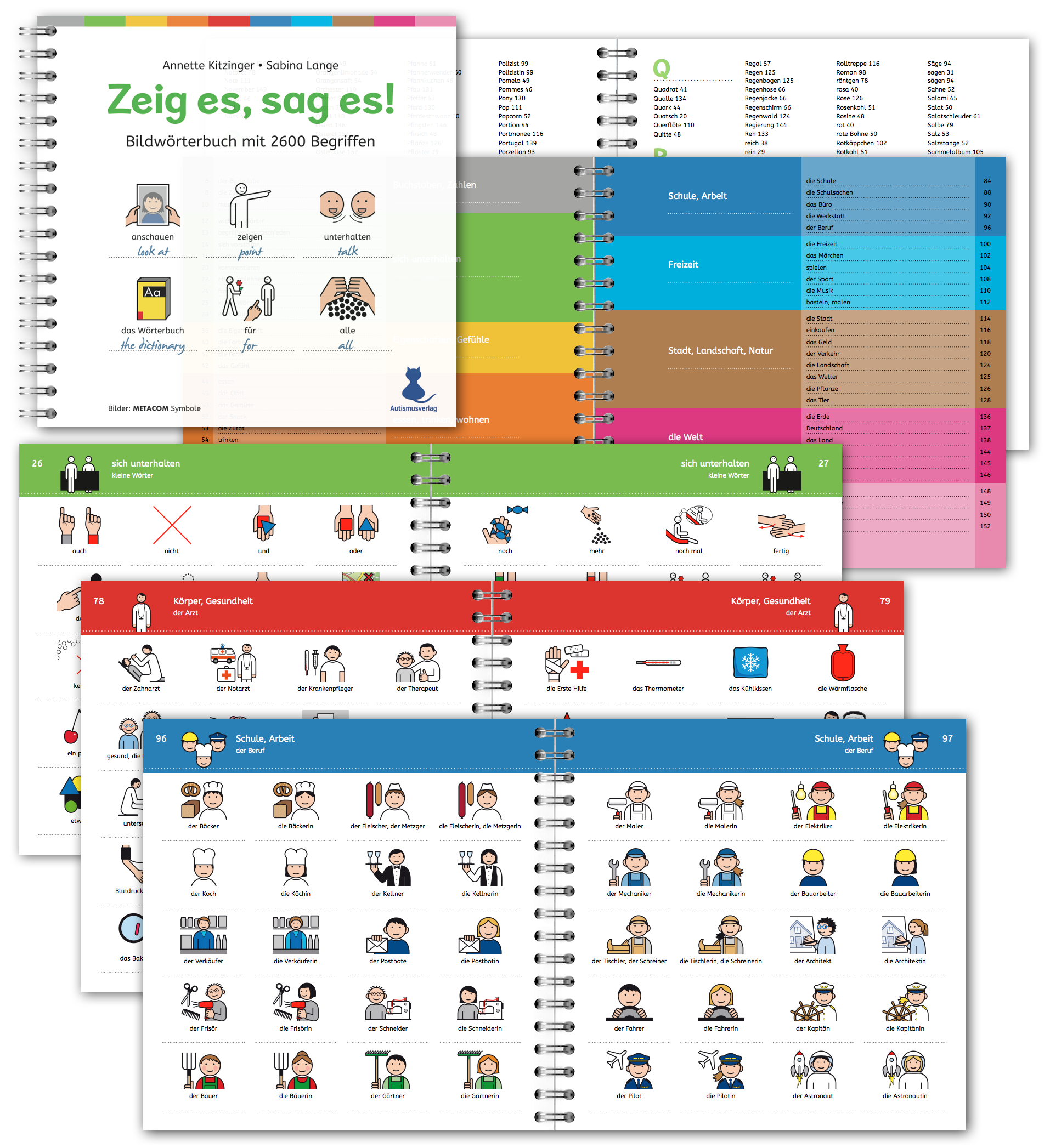 Zeig es, sag es! ist ein Bildwörterbuch für alle kleinen und grossen Leute. Es enthält mehr als 2600 Begriffe und METACOM Symbole zum Entdecken, Deutsch lernen und Kommunizieren. Jedem Symbol ist die passende deutsche Bezeichnung zugeordnet. Vor Nomen steht zusätzlich der bestimmte Artikel. Darunter ist Platz für persönliche Eintragungen. Dies können zum Beispiel Übersetzungen in eine andere Sprache oder Notizen zu weiteren Wortformen sein. Der umfangreiche Wortschatz von Zeig es, sag es! ist in zehn farbig markierte Kapitel untergliedert und deckt viele wichtige Themen ab. In einem Stickwortverzeichnis sind alle Begriffe alphabetisch aufgeführt.