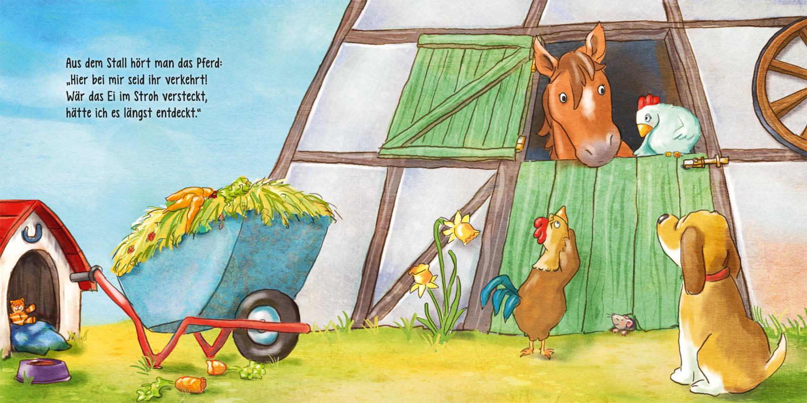 Lustiges Osterbuch in Reimen für Kleine: Alle Bauernhoftiere helfen mit, Mama Huhns Ei zu suchen.