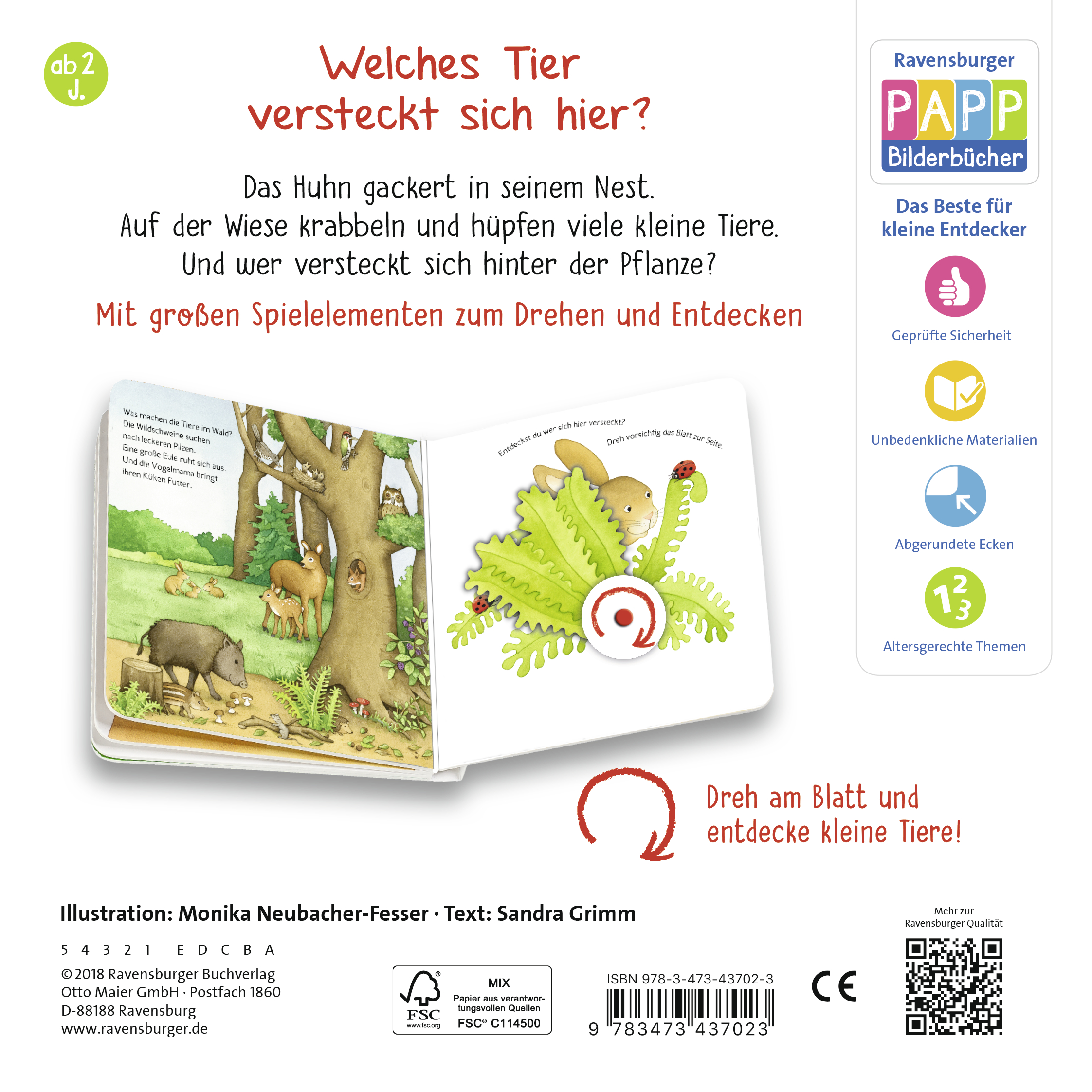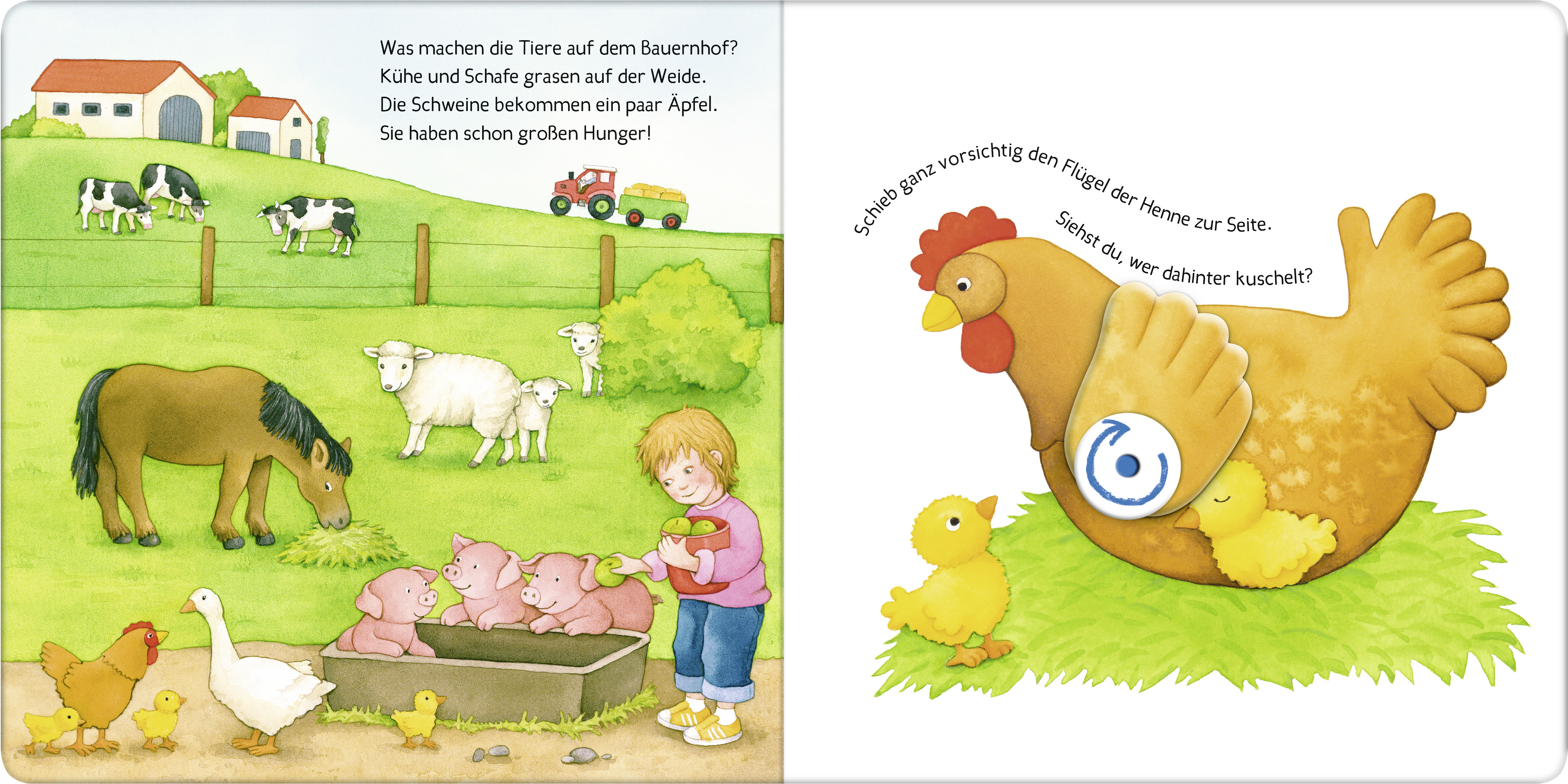 Rundherum und hin und her – hier können die Kleinen große Motive drehen und schieben. Ein besonderes Spielbuch für Groß und Klein mit versteckten Häschen, flatternden Schmetterlingen, einem kleinen Igel und vielen anderen Tieren.