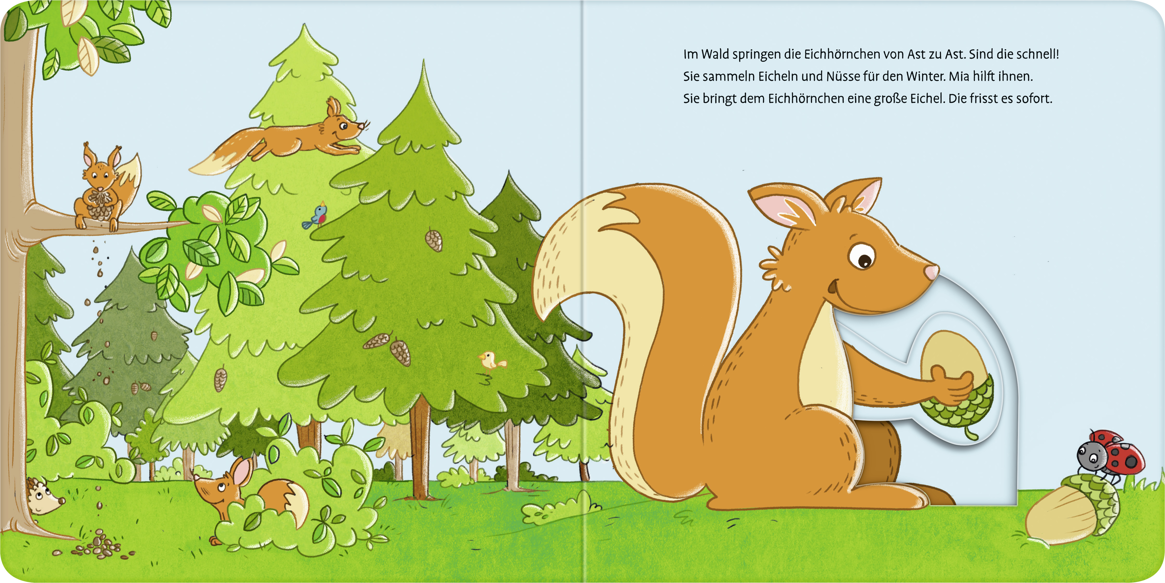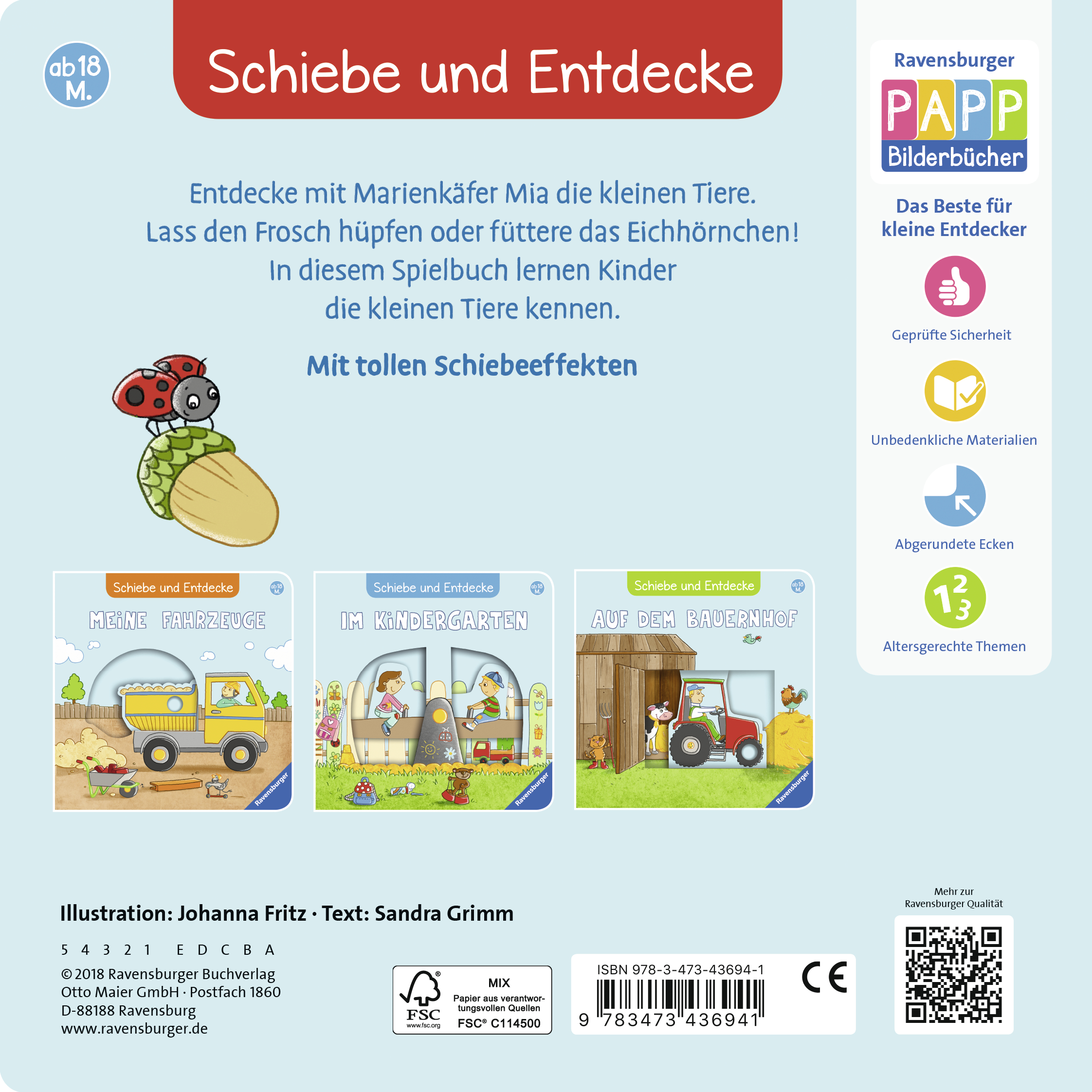 Schiebe und entdecke die kleinen Tiere! Wo fliegen die Bienen? Was futtert das Eichhörnchen? Wie hoch springt der Frosch? Marienkäfer Mia zeigt dir ihre Welt.Große und stabile Schiebeeffekte erwecken die kleinen Tiere zum Leben.