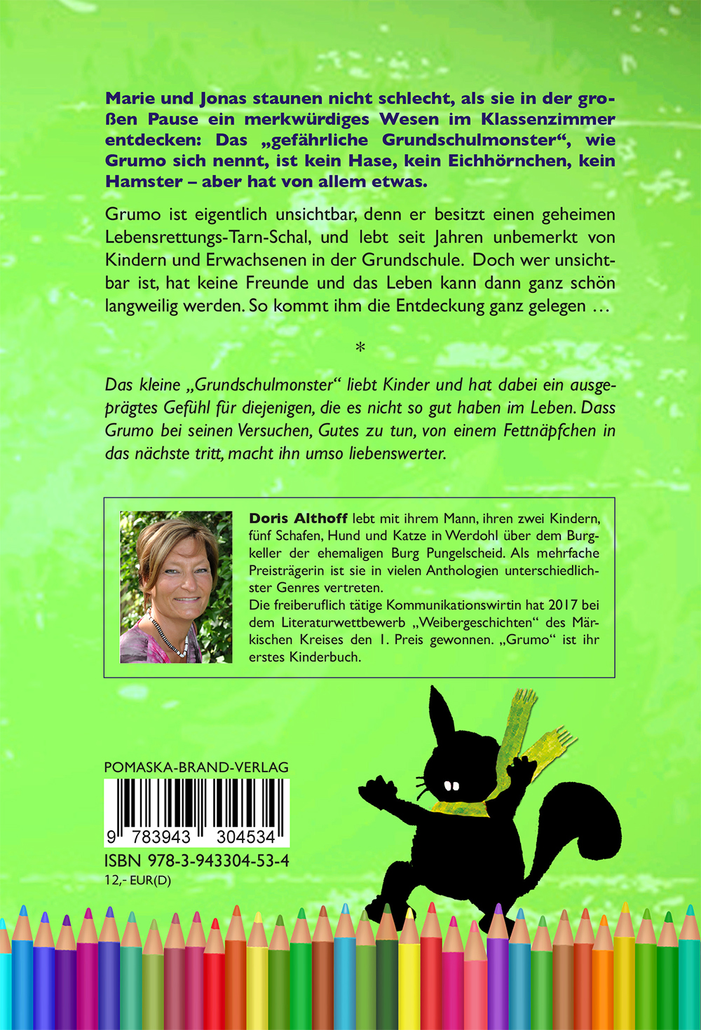 Doris Althoff lebt mit ihrem Mann, ihren zwei Kindern, fünf Schafen, Hund und Katze in Werdohl über dem Burgkeller der ehemaligen Burg Pungelscheid. Als mehrfache Preisträgerin ist sie in vielen Anthologien unterschiedlichster Genres vertreten. Die freiberuflich tätige Kommunikationswirtin hat 2017 bei dem Literaturwettbewerb „Weibergeschichten“ des Märkischen Kreises den 1. Preis gewonnen. „Grumo“ ist ihr erstes Kinderbuch.