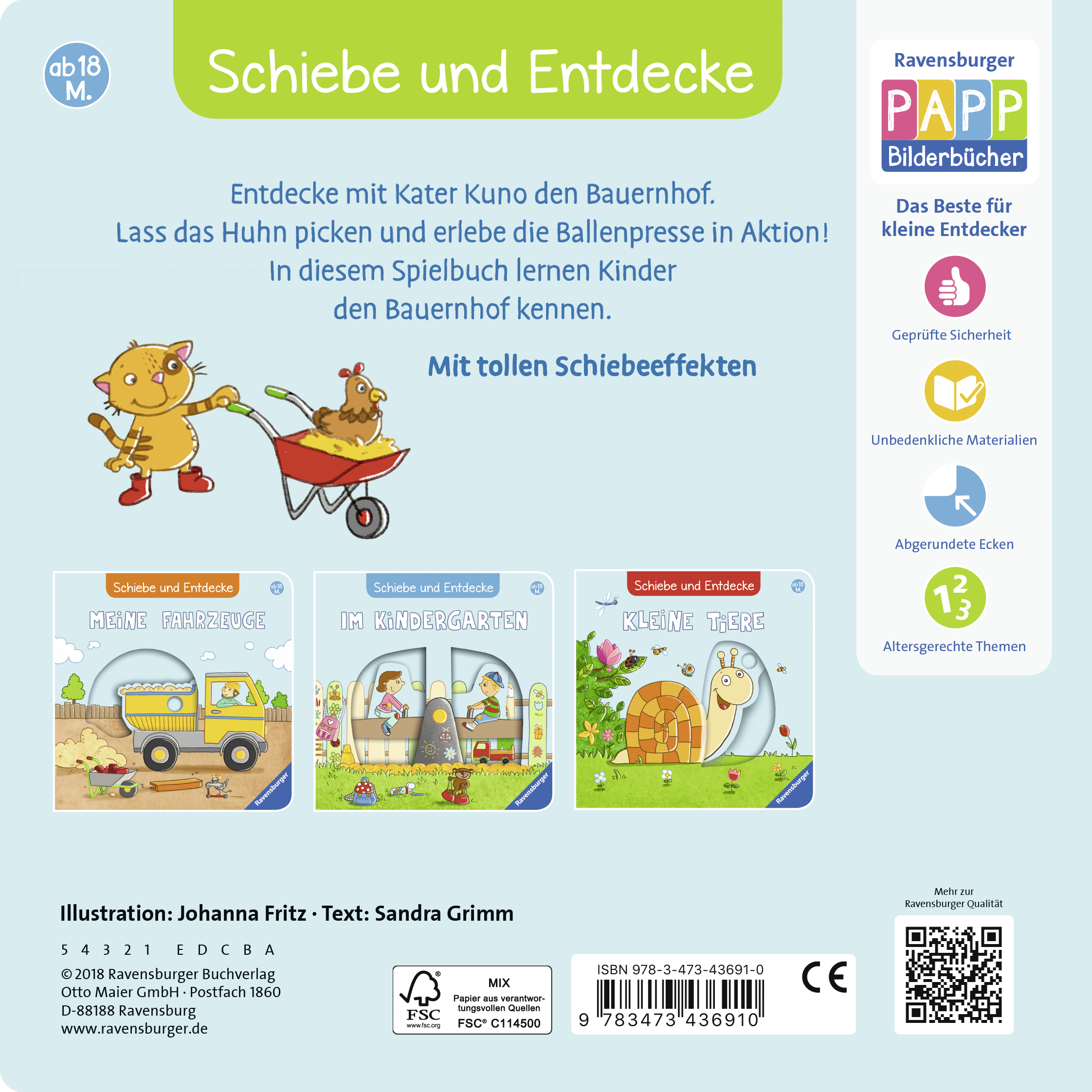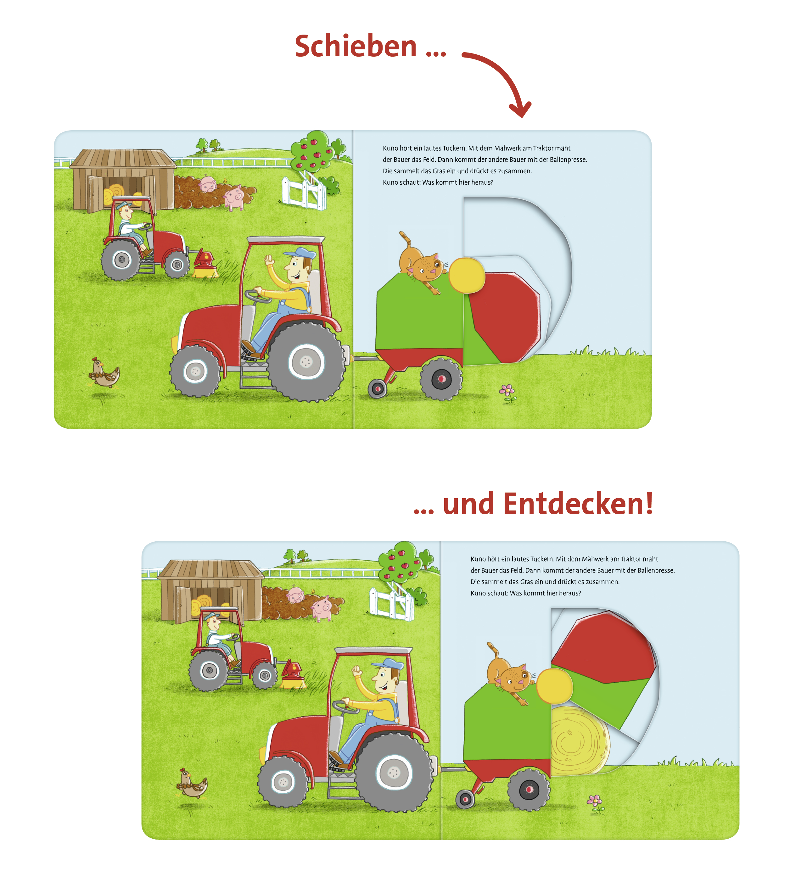 Schiebe und entdecke die Tiere und Fahrzeuge auf dem Bauernhof! Was frisst das Huhn? Was kommt aus der Ballenpresse? Woher kommt die Milch? Kater Kuno zeigt dir seine Welt.Große und stabile Schiebeeffekte erwecken Tiere und Fahrzeuge zum Leben.