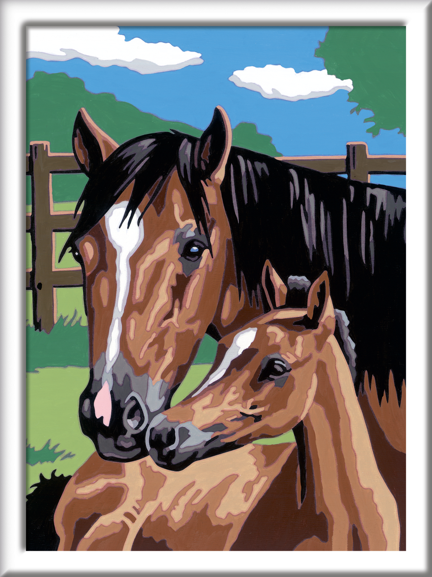 Dank der farbigen Motivlinien, können die Kinder das ganze Motiv Pferd mit Fohlen und die Farben schneller erkennen. Der Pinsel hat eine gute Führung und so entsteht ein perfektes Bild.