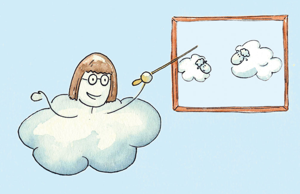 Als die Lehrerin, Frau Wolken-Wichtig-Wissensmeyer, in der Schule auch andere Wolkenarten vorstellt, ist für die kleine Regenwolke plötzlich alles klar. Sie will eine Schönwetter-Schäfchen-Wolke werden.