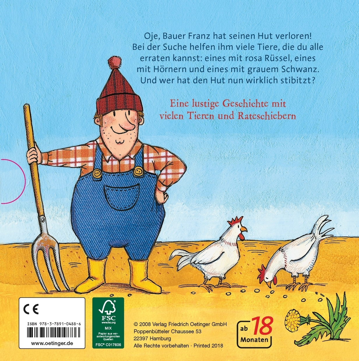 Such- und Ratespaß auf dem Bauernhof. Dem Bauern Franz ist irgendwo auf seinem Hof sein Hut abhanden gekommmen. Bei der Suche danach helfen ihm alle möglichen Tiere. Doch welche Tiere sind das nur? Eins hat einen rosa Rüssel. Ein anderes hat Hörner und wieder ein anderes einen grauen Schwanz. Das Tiere-Raten macht kleinen Kindern großen Spaß. Mit seitlichen Schiebern findet man heraus, ob man das richtige Tier erkannt hat. Und wer hat den Hut nun wirklich stibitzt? Liebenswerte Bauernhofgeschichte mit spannenden Schiebereffekten.