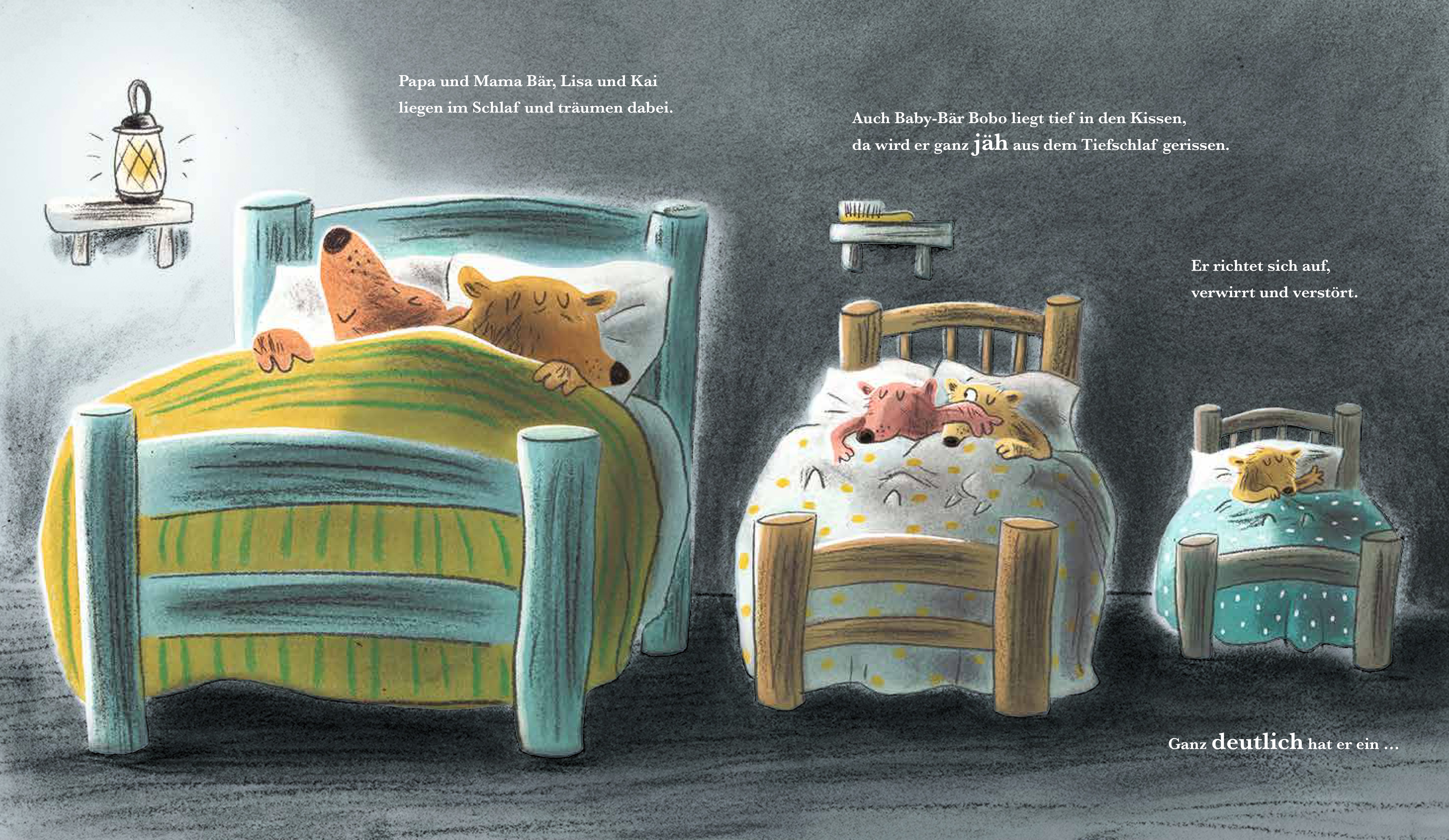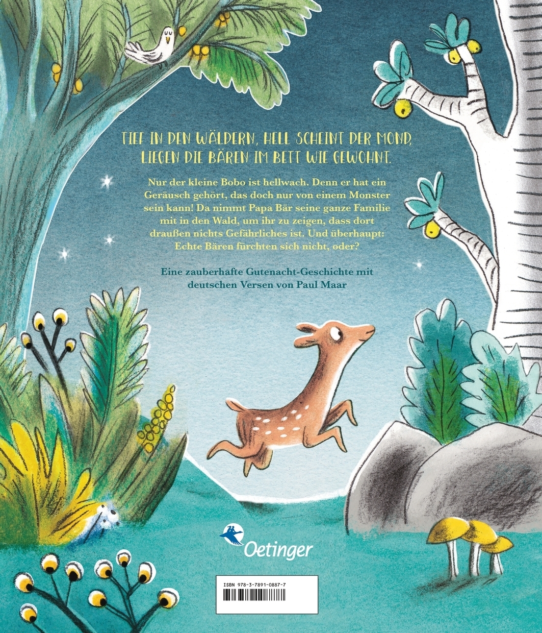 "Tief in den Wäldern, hell scheint der Mond, liegen die Bären im Bett wie gewohnt." Nur der kleine Bobo ist hellwach. Denn er hat ein Geräusch gehört, das doch nur von einem Monster sein kann! Da nimmt Papa Bär seine ganze Familie mit in den Wald, um ihr zu zeigen, dass dort draußen nichts Gefährliches ist. Und überhaupt: Echte Bären fürchten sich nicht, oder? Eine humorvolle Gute-Nacht-Geschichte mit charmanten Versen von Paul Maar, die die Angst vor unsichtbaren Monstern in der Nacht vertreibt.