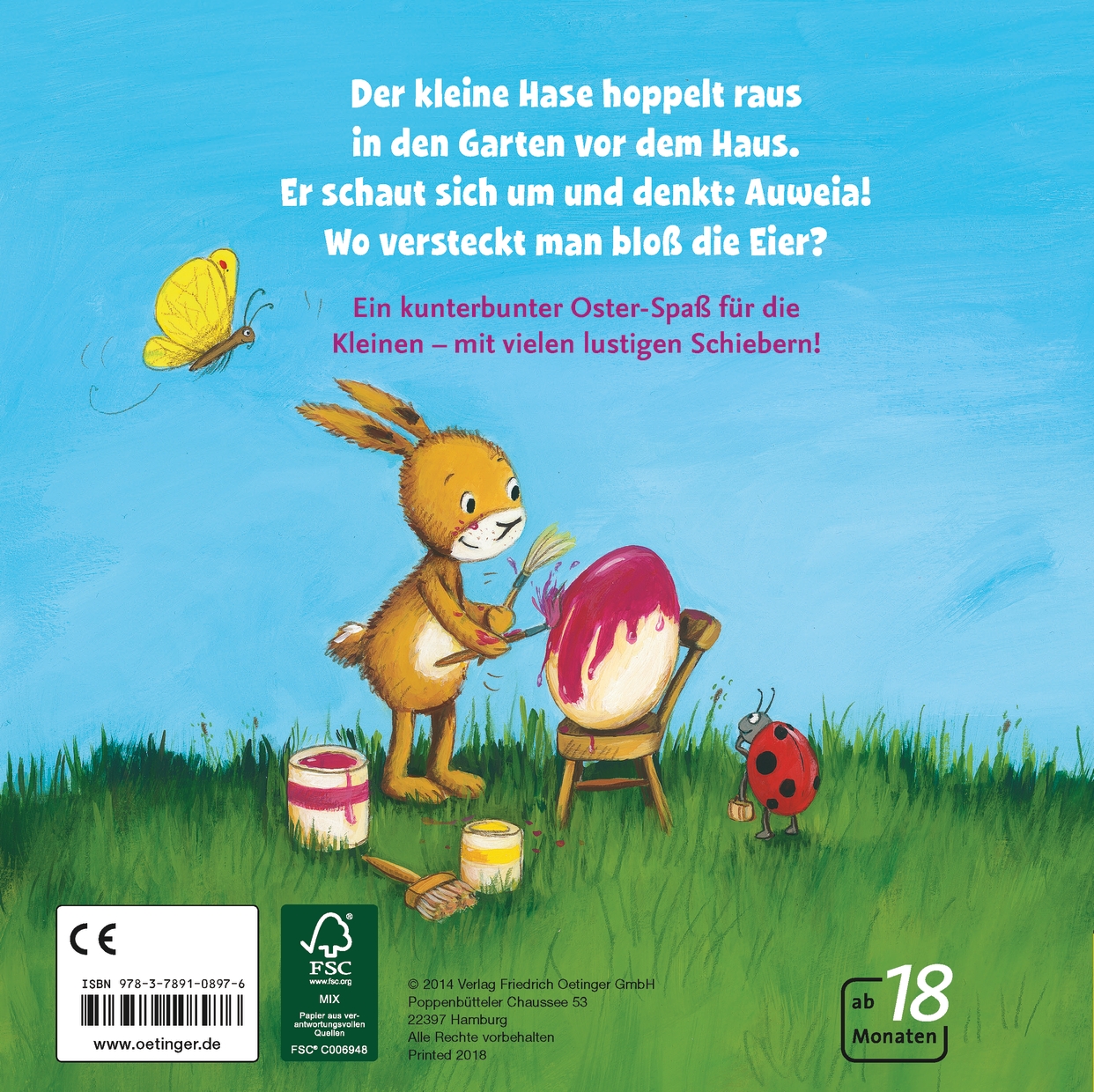 Hurra, hurra! Endlich ist es soweit, der kleine Hase darf zum ersten Mal ein Ei verstecken: "Es ist Ostern, heut geht's los! Der kleine Hase ist nun groß. 'Heut darf ich ein Ei verstecken.' Ob die andren es entdecken?" Aber wo ist nur der beste Platz für ein Versteck? Vielleicht helfen die anderen Tiere dem kleinen Hasen, einen geeigneten Ort zu finden. Bunter Oster-Reime-Spaß mit lustigen Schiebern zum Mitraten.