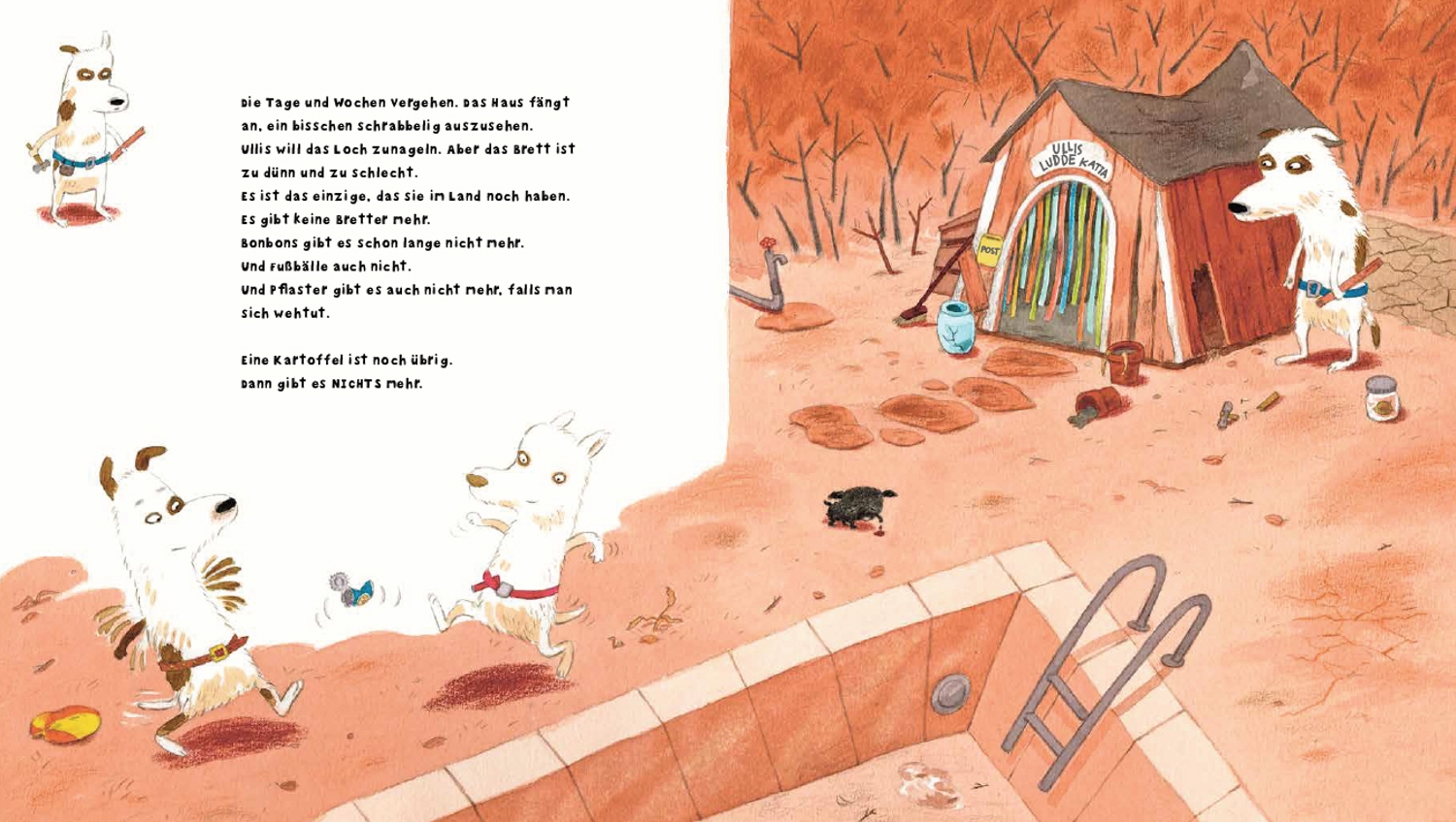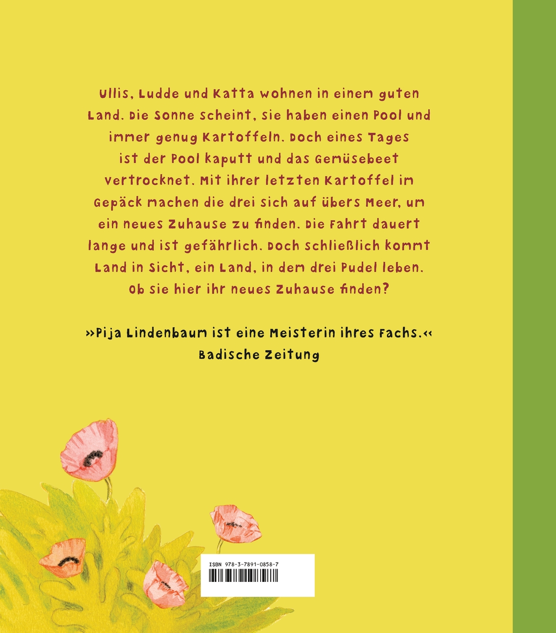 Reise ins Unbekannte: Die drei kleinen Hunde Ullis, Ludde und Katta wohnen in einem guten Land. Die Sonne scheint, sie haben einen Pool und immer genug Kartoffeln. Doch eines Tages ist der Pool kaputt und das Gemüsebeet vertrocknet. Mit ihrer letzten Kartoffel im Gepäck machen sie sich auf übers Meer, um ein neues Zuhause zu finden. Die Fahrt dauert lange und ist gefährlich. Doch schließlich kommt Land in Sicht, ein Land in dem drei Pudel leben. Werden sie die Neuankömmlinge aufnehmen? Eine Geschichte über Flucht, Neuanfang und der Offenherzigkeit gegenüber Fremden, von Jugendliteraturpreisgewinnerin Pija Lindenbaum.