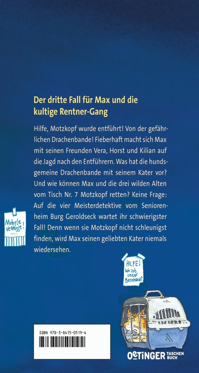 Hier ermitteln Jung und Alt gemeinsam! Aufregung bei Max und seinen Rentner-Freunden Vera, Horst und Kilian: Kater Motzkopf wurde entführt! Schnell ist der ungewöhnlichen Detektiv-Gang klar, dass die hundsgemeine Drachen-Bande ihre Langfinger im Spiel hat. Jetzt müssen Max und die wilden Alten von Tisch 7 den Rollator aber schneller schieben, wenn sie Motzkopf lebend wiedersehen wollen.