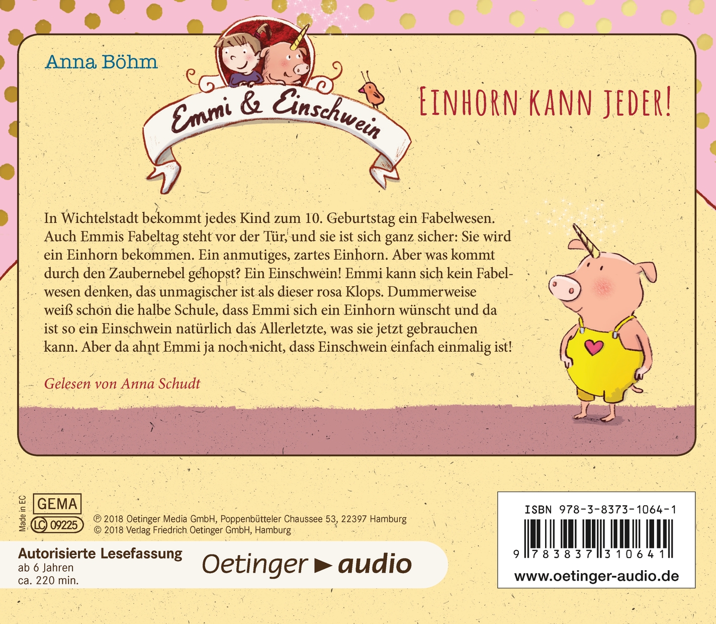 Ein Schwein mit Horn und dem Herz am rechten Fleck. Im Emmis Welt bekommt jedes Kind zum 10. Geburtstag ein Fabelwesen, das es fortan durchs Leben begleitet. Emmi hofft auf ein Einhorn. Die Enttäuschung ist groß, als am Stichtag ein rosa Hausschwein mit einem Horn vor Emmi steht. Für die Schule wird es kurzerhand als Baby-Einhorn verkleidet und wird prompt von allen geliebt. Nur der missgünstige Herr Bockel und Antonia, die in der Klasse alles bestimmt, gönnen Emmi ihren Triumph nicht ... Eine warmherzige Geschichte über Freundschaft und Identität. Gelesen von TATORT-Kommissarin Anna Schudt.