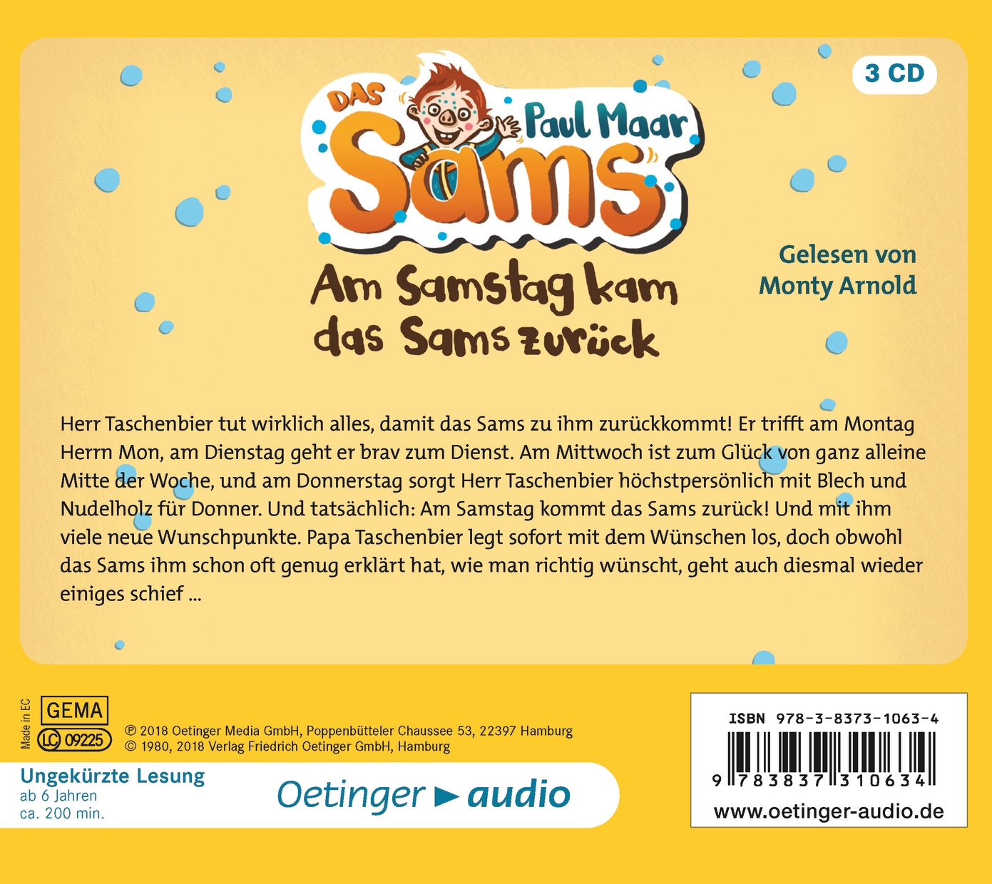 lt;p>Herr Taschenbier tut wirklich alles, damit das Sams zu ihm zurück kommt! Er trifft am Montag Herrn Mon, am Dienstag geht er brav zum Dienst. Am Mittwoch ist zum Glück ganz von alleine Mitte der Woche und am Donnerstag sorgt Herr Taschenbier höchstpersönlich mit Blech und Nudelholz für Donner. Und tatsächlich: Am Samstag kommt das Sams zurück! Und mit ihm viele neue Wunschpunkt. Papa Taschenbier legt sofort mit dem Wünschen los, doch obwohl das Sams ihm schon oft erklärt hat, wie man richtig wünscht, geht auch dieses Mal wieder einiges schief ...