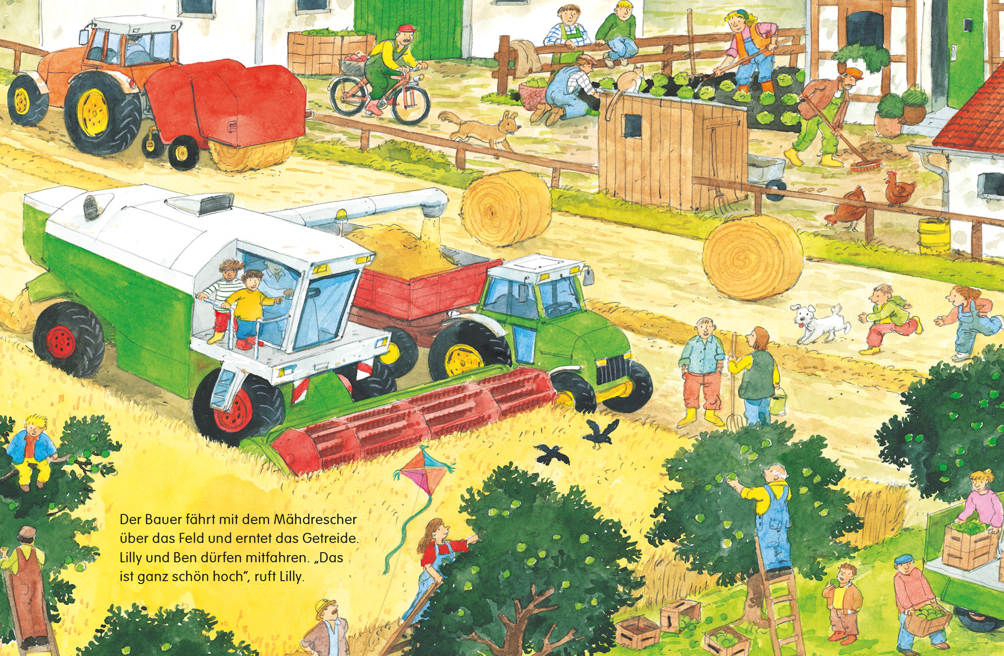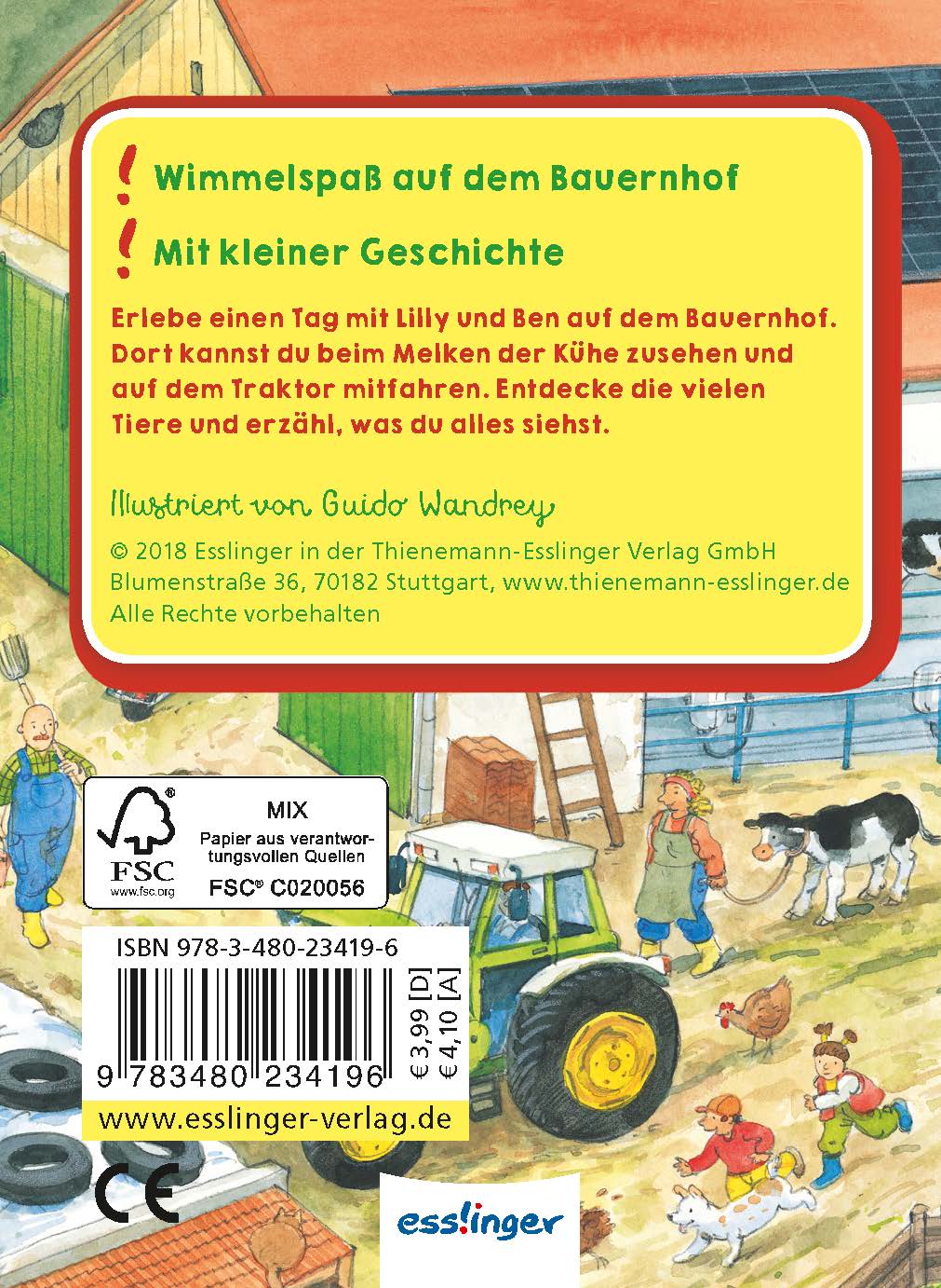 Wimmelspaß auf dem Bauernhof, mit kleiner Geschichte und Suchaufgaben: Lilly und Ben verbringen einen tollen Tag auf dem Bauernhof. Sie füttern die Hühner, helfen beim Melken der Kühe und dürfen auf dem Traktor mitfahren. Die detailreichen Bilder regen zum Suchen, Entdecken und Erzählen an und fördern so spielerisch die kindliche Sprachentwicklung.