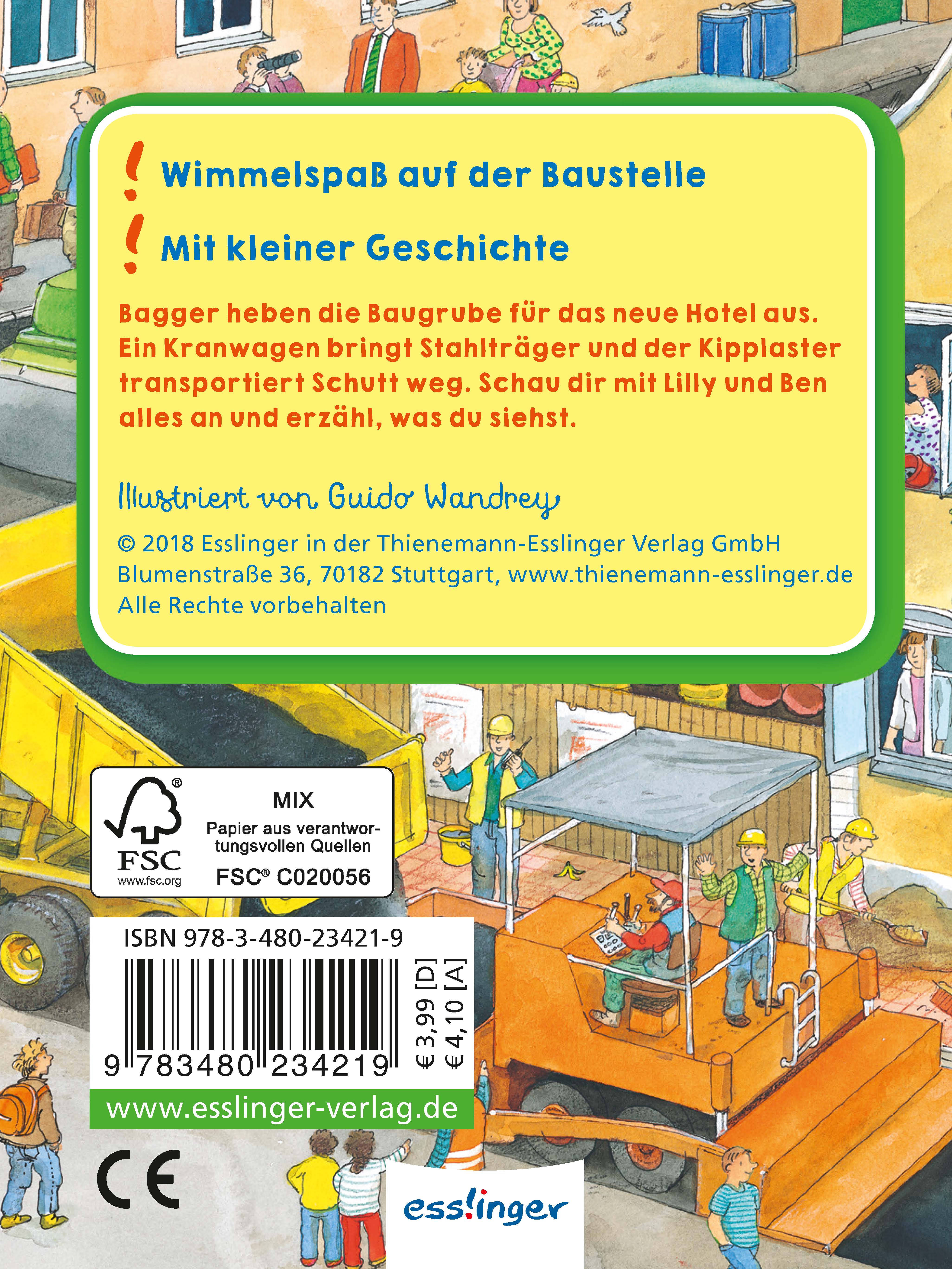 Wimmelspaß auf der Baustelle, mit kleiner Geschichte und Suchaufgaben: Lilly und Ben schauen den Bauarbeitern zu. Bagger heben die Baugrube für das neue Hotel aus. Ein Kranwagen bringt Stahlträger und der Kipplaster transportiert Schutt weg. Die detailreichen Bilder regen zum Suchen, Entdecken und Erzählen an und fördern so spielerisch die kindliche Sprachentwicklung.