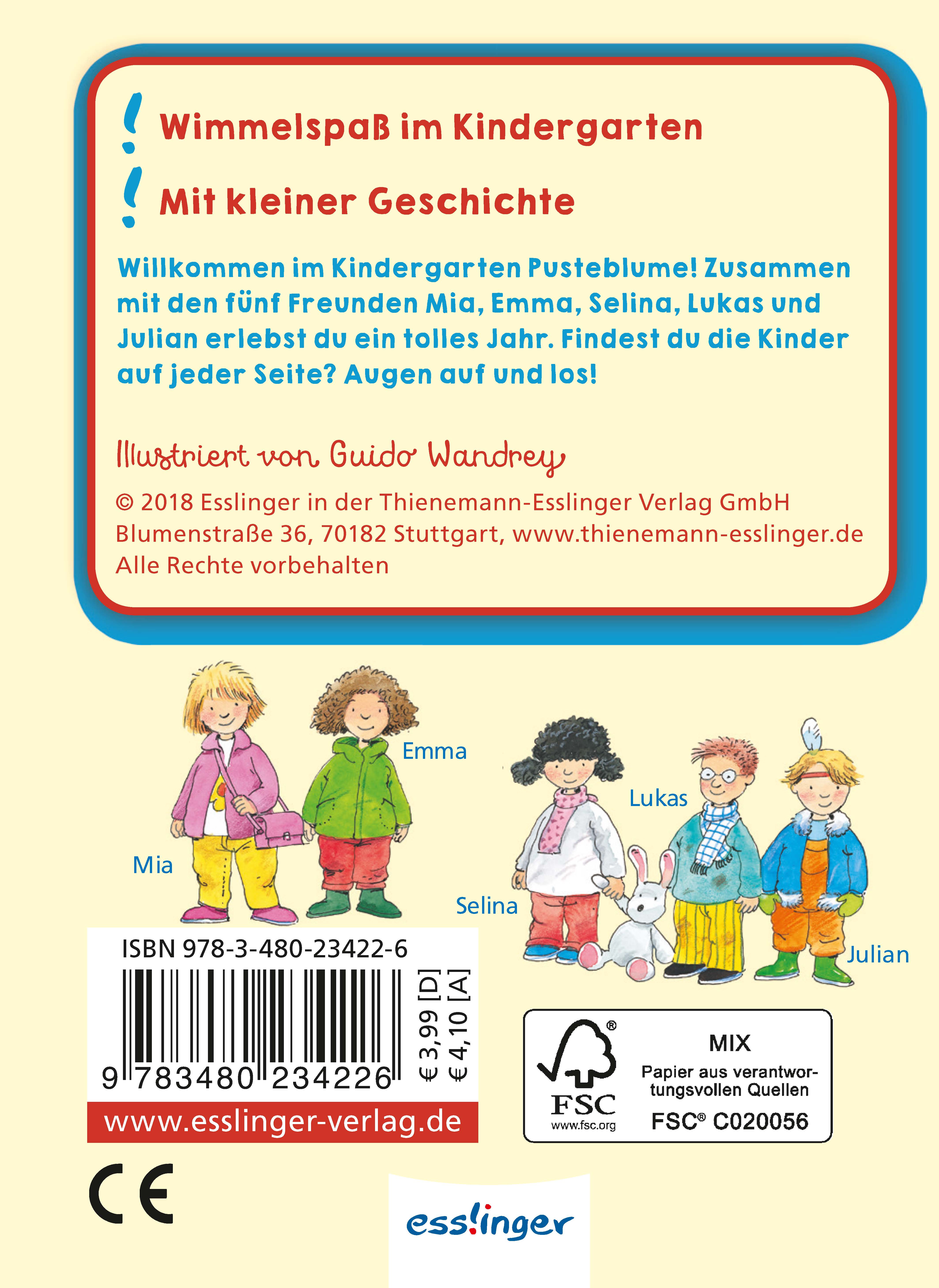 Wimmelspaß im Kindergarten, mit kleiner Geschichte und Suchaufgaben: Willkommen im Kindergarten Pusteblume! Die Freunde Mia, Emma, Selina, Lukas und Julian erleben ein tolles Jahr, vom ersten Frühlingstag im Garten und dem Ostereiersammeln bis zum Laternenumzug im Winter und dem Besuch vom Nikolaus. Such die fünf Kinder auf jeder Seite - Augen auf und los! Die detailreichen Bilder regen zum Suchen, Entdecken und Erzählen an und fördern so spielerisch die kindliche Sprachentwicklung.