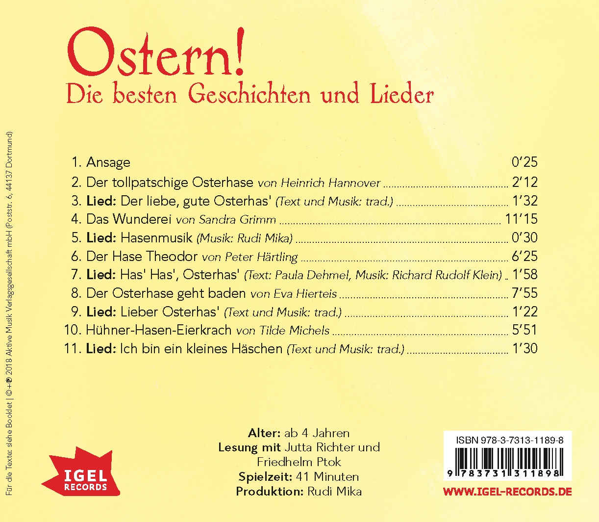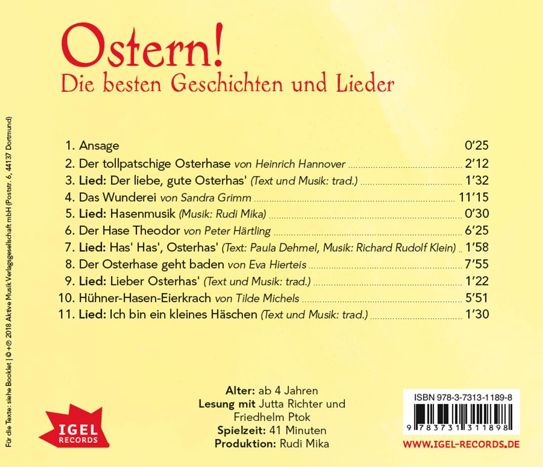| Schlagworte | Frühjahr • Frühling • Geschenk zu Ostern • Hasen • Kinderbuch ab 4 • Kleinkind • Musik • Ostergeschenk • Oster-Geschichten • Osterhase • Oster-Klassiker • Ostern • Osternest |